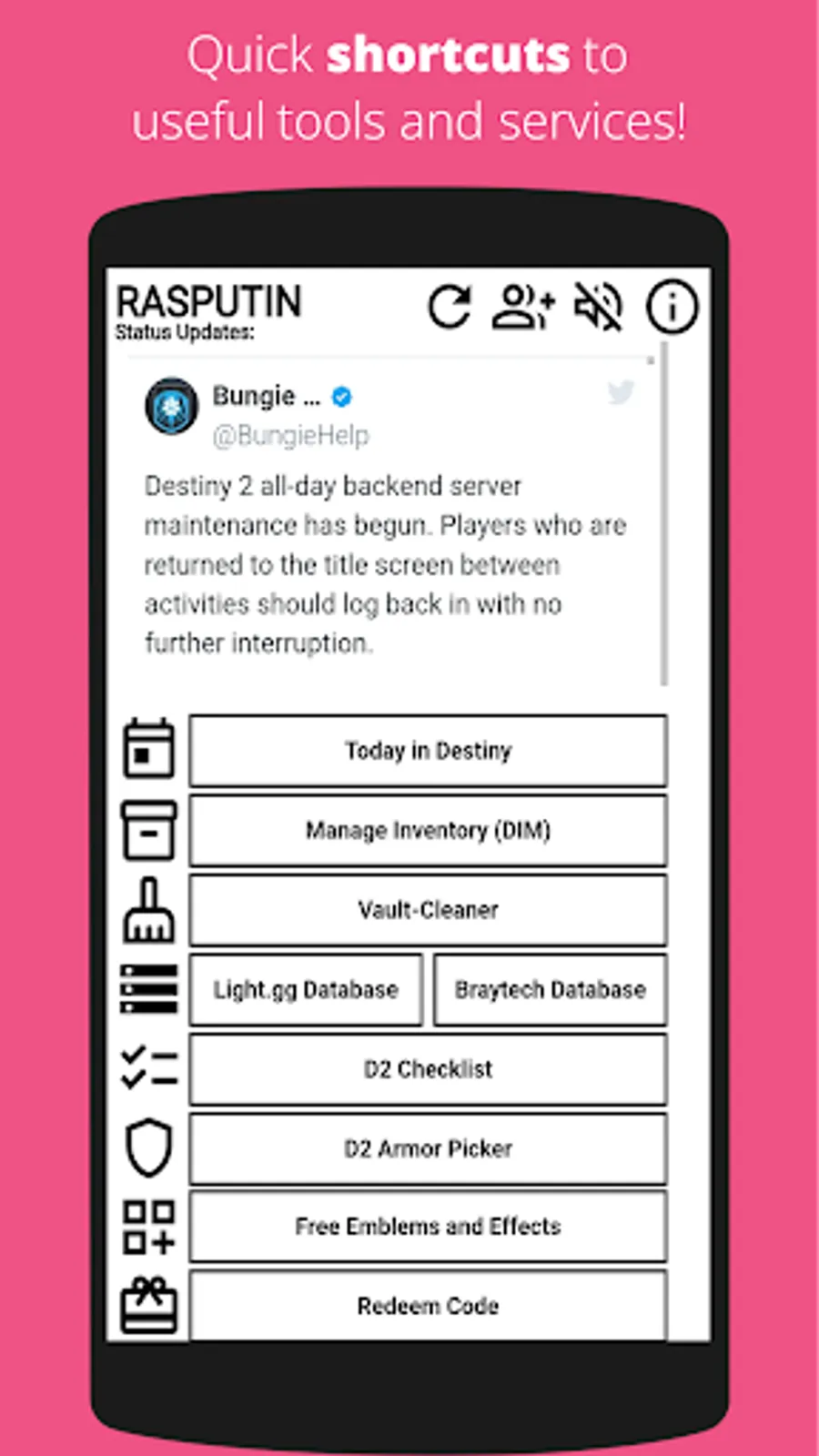 It allows you to quickly access free emblem codes and other tools to manage your inventory, see daily challenges and events, find the best gear in your vault and more.