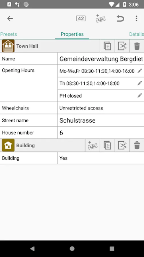 Any accidental change can be undone and all changes are listed for review before upload. Tag-autocompletion, JOSM compatible presets, links to the translated map-features pages and even auto-completing nearby street names help to find the right tags to use.