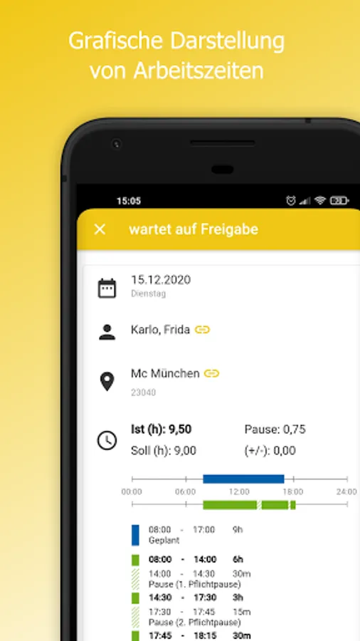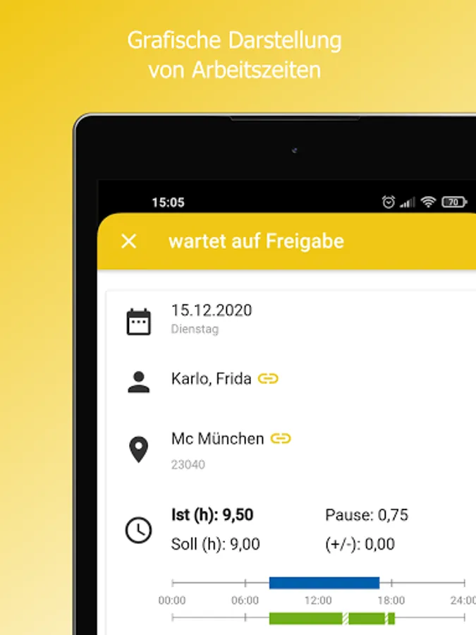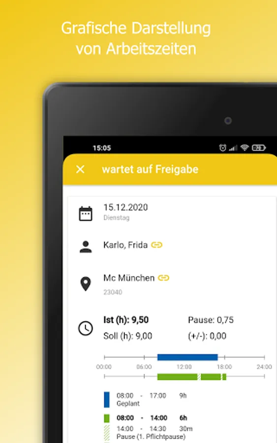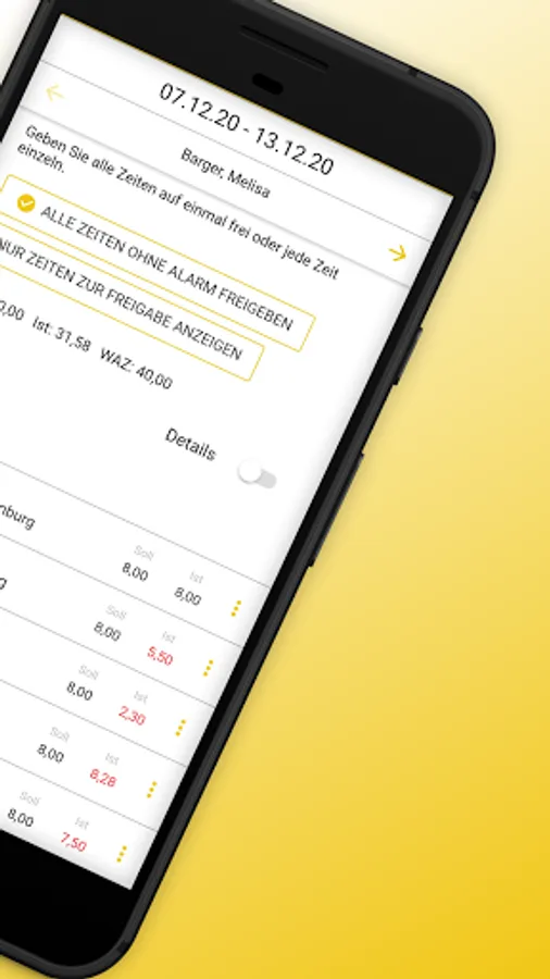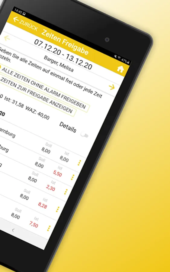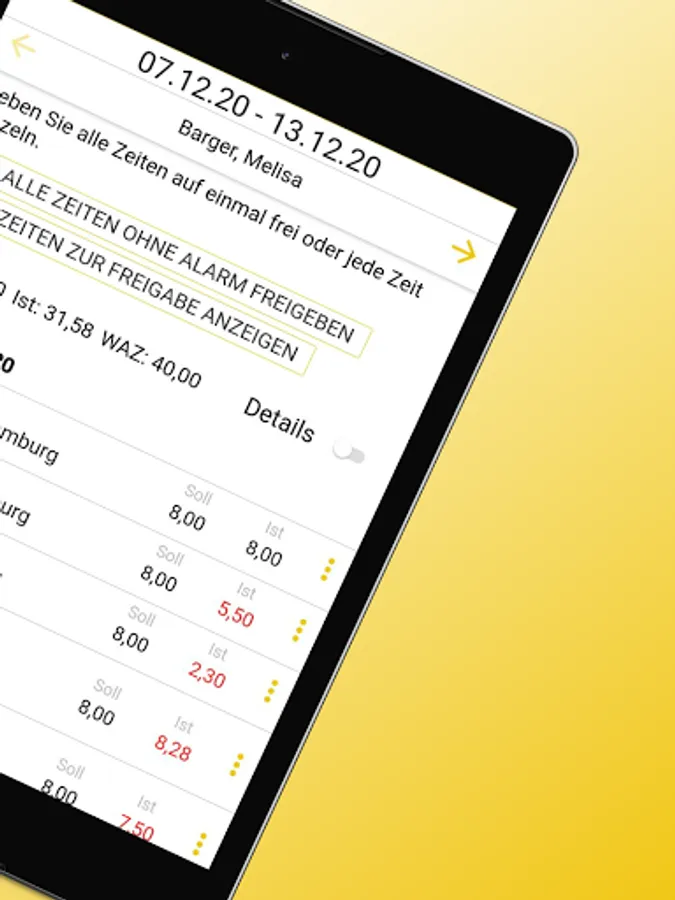 The app can be used to compare actual and target times or add them manually. The employee monitor shows where times are missing at all times.
