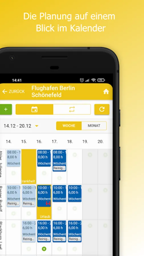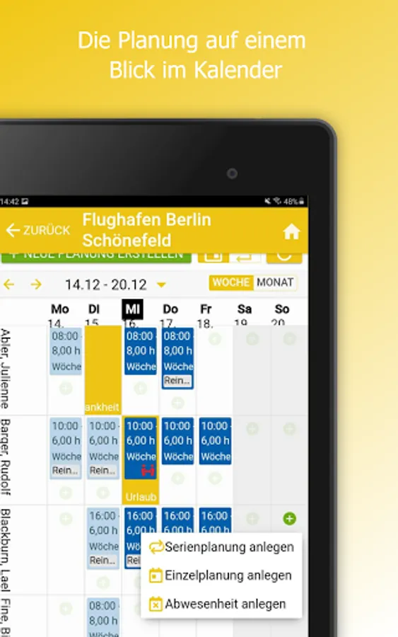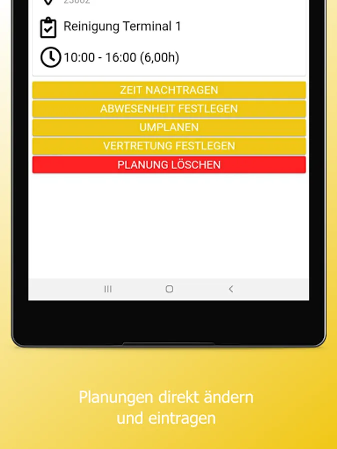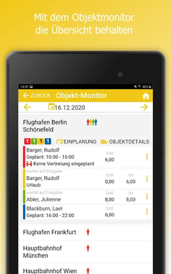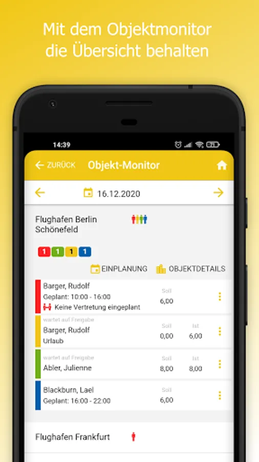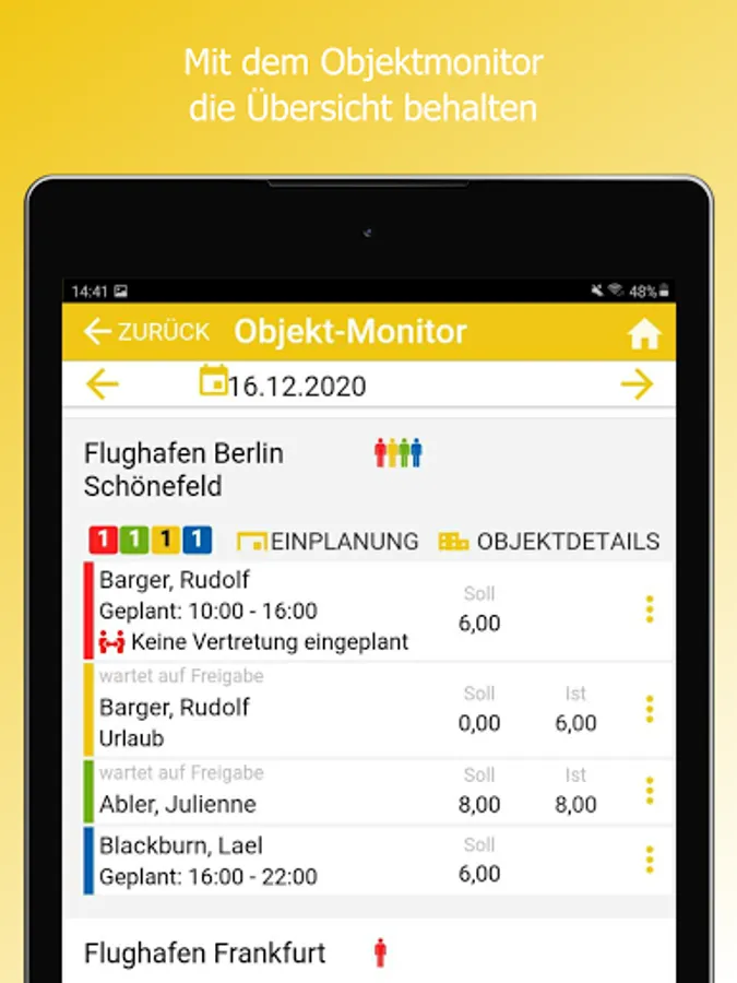 The app can be used to compare actual and target times or add them manually. The employee monitor shows where times are missing at all times.