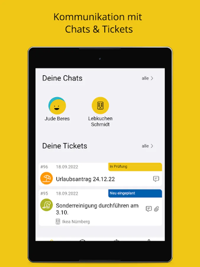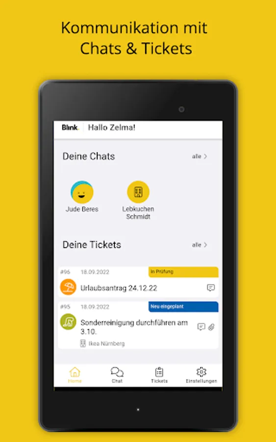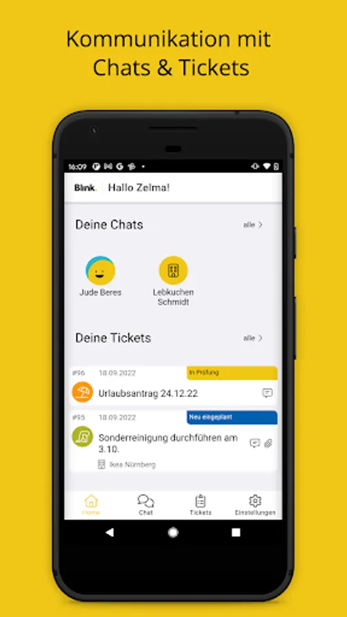 The Blink me app is the employee app for building cleaners. Cleaning staff not only use the Blink me app to record time via QR code or NFC, but can also communicate with their colleagues or superiors via the integrated chat function. The ticket function enables the recording of vacation requests, sick notes or complaints. The news system informs employees about news from the company and the vacation overview shows exactly how many days of vacation can still be taken.