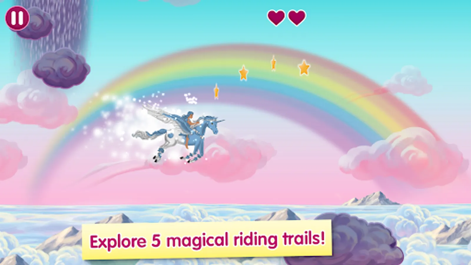 • Fly over the rainbow or through the magical starry sky on your Pegasus