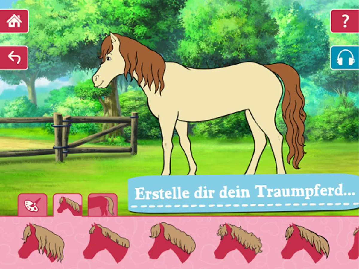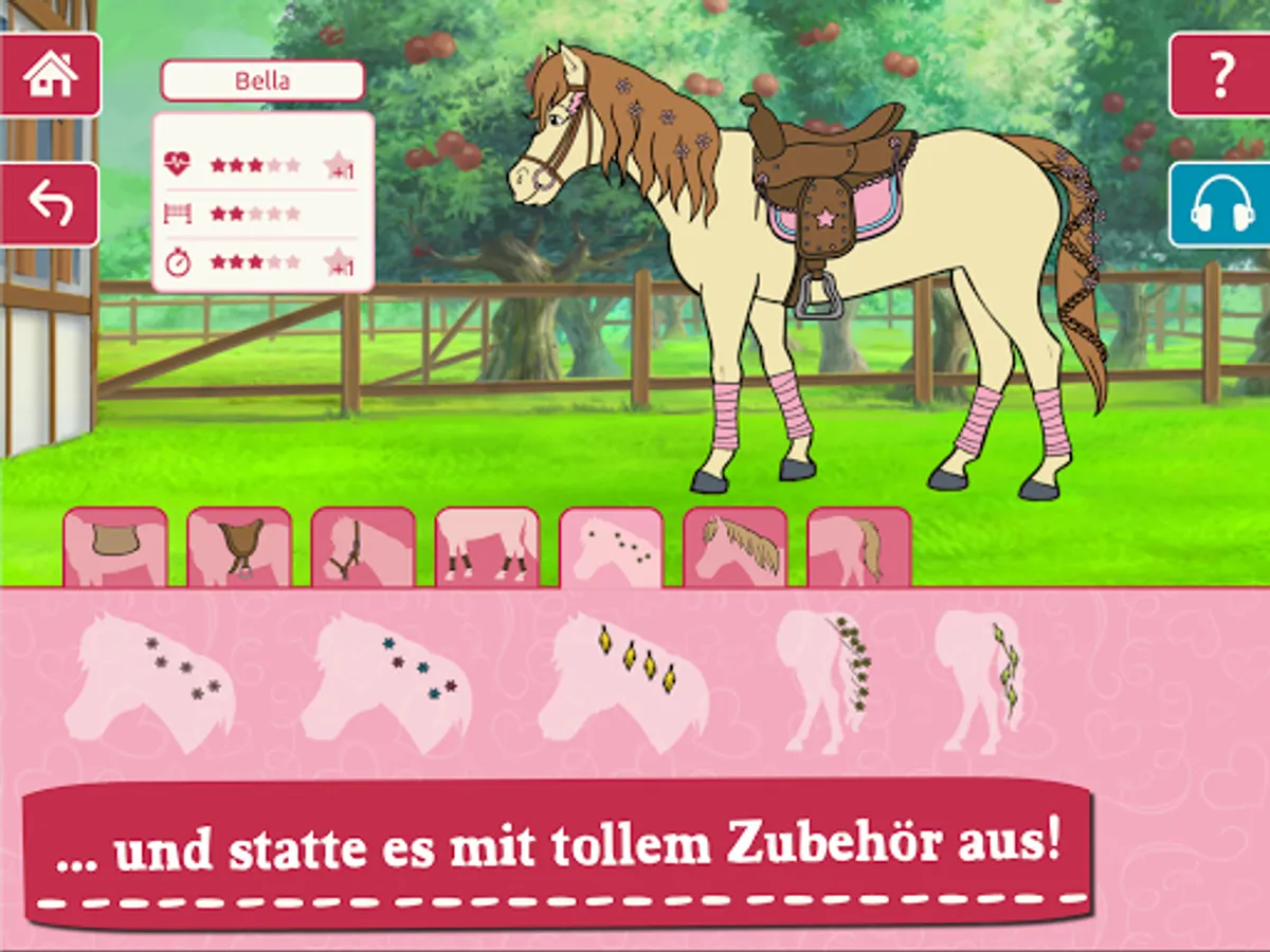Always wanted your own horse? Great! Here you have the opportunity to choose your dream horse! Choose between different manes, tails and coat colors as well as many saddles, halters and horse accessories to make your horse even more beautiful. Is your horse hungry or needs to be re-shod? In two collecting games, collect food and tools so that your horse always stays in top shape and equip it with great accessories to get it ready for competition.