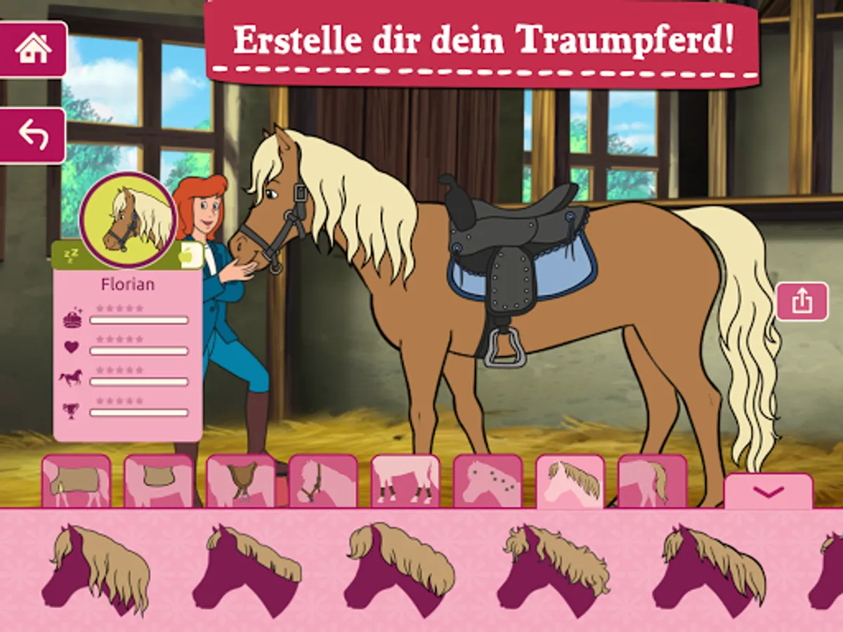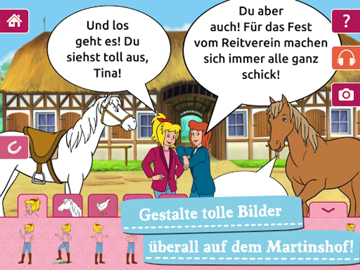 At Martinshof you can experience a lot with the young witch Bibi Blocksberg and her horse friend Tina: Take care of your own horses, ride them out or train them in show jumping. Everywhere on the riding stables you can design great pictures and use them to create your own comics. While playing, you can also listen to the exciting Bibi & Tina audio book “Shadows over the Martinshof!” Within the app. Sounds great, doesn't it?