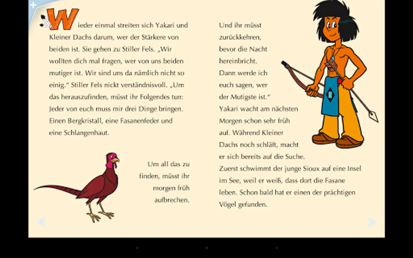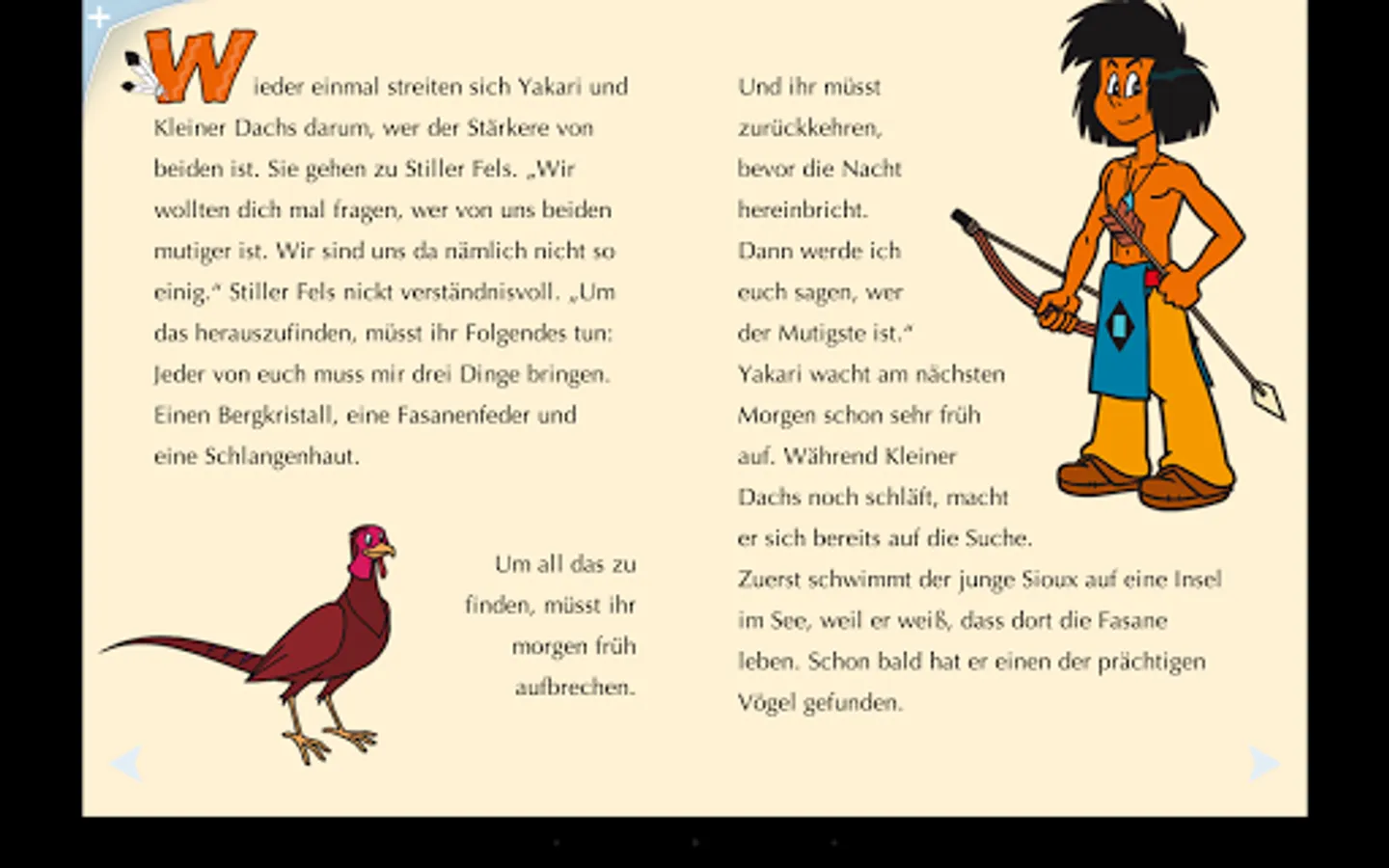 Yakari and Little Badger argue about who is the stronger and braver of the two. Go to the Indians Stiller Rock, which provides them a task to clarify this: "To find out, you must do the following: Each of you must bring me three things. A rock crystal, a pheasant feather and a snake skin. In order to find all that you need to leave early tomorrow. And you have to return before nightfall. Then I'll tell you who is the bravest. "Yakari and Little Badger are on their way to solve the problem and end up experiencing a surprise.