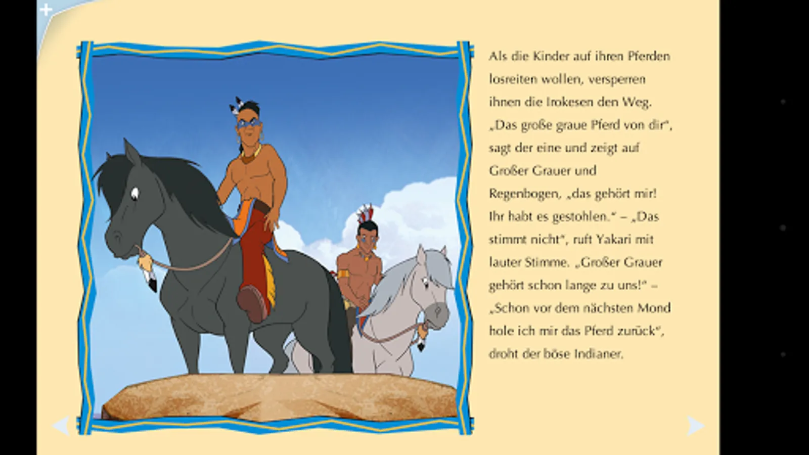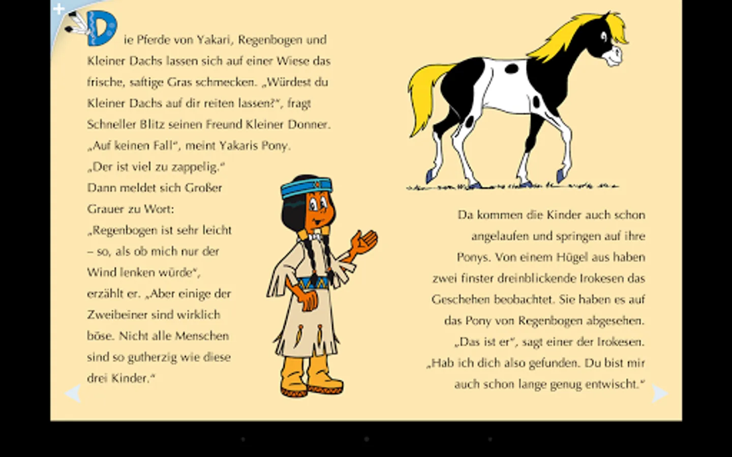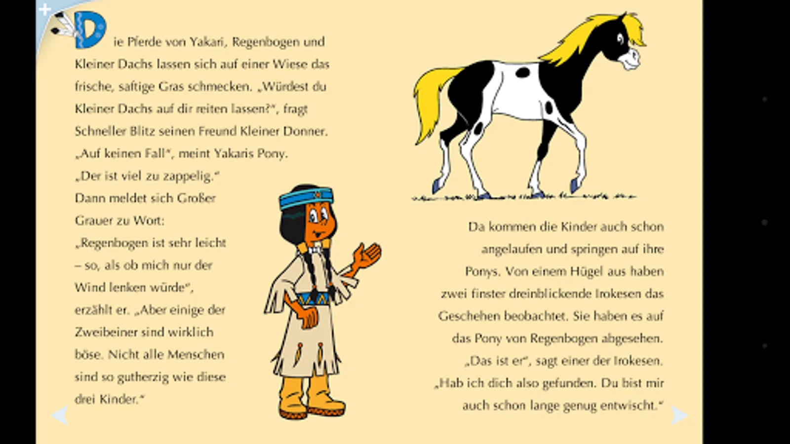 Yakari, Little Badger and rainbow, with their ponies on the road, when suddenly two Iroquois and claim Big Grey, the Pony of Rainbow, the Indian girl is theirs. This of course is not true. It was Yakari's horse Little Thunder, who brought the injured to the Sioux Pony some time ago. There, Great Gray was nursed back to health and has remained with the tribe. But the two Iroquois are determined to bring Big Grey se. For Yakari and his friends a dangerous situation, because they are too far away from their tribe in order to ride home quickly can. The friends have to camp out there. As Yakari and Little Badger wake up the next morning, Big Gray is gone. If the two Iroquois reached their destination?