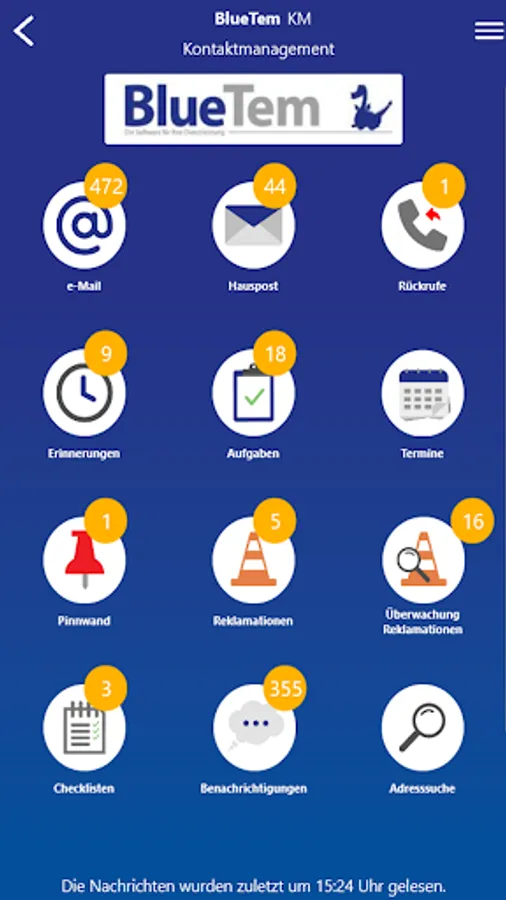 With this app 'BlueTem Contact Management' you can manage your e-mails, internal mail, callbacks, reminders, tasks, appointments, pin board and complaints on the go.