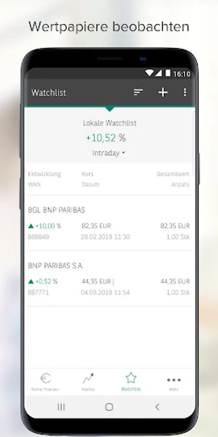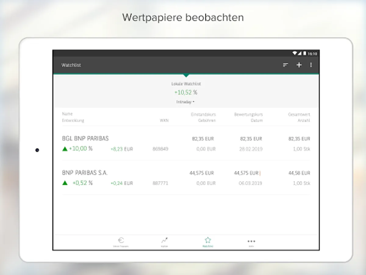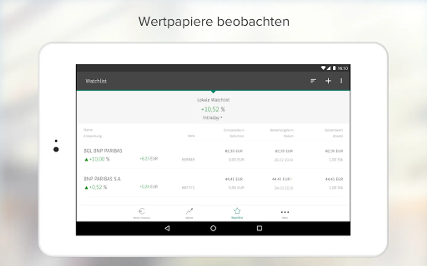 In the Depots area you can see the development of your depot values. With the help of various display options you can configure the display according to your requirements. Of course, securities can also be bought or sold with just a few clicks. With your individual watchlists you can also keep an eye on all securities that are of particular interest to you. You can sync your watchlists to use and edit them on all your devices.