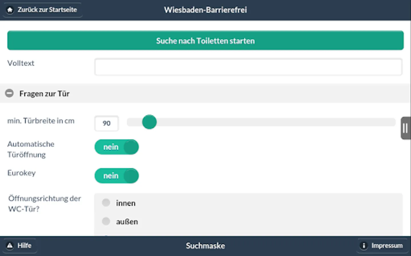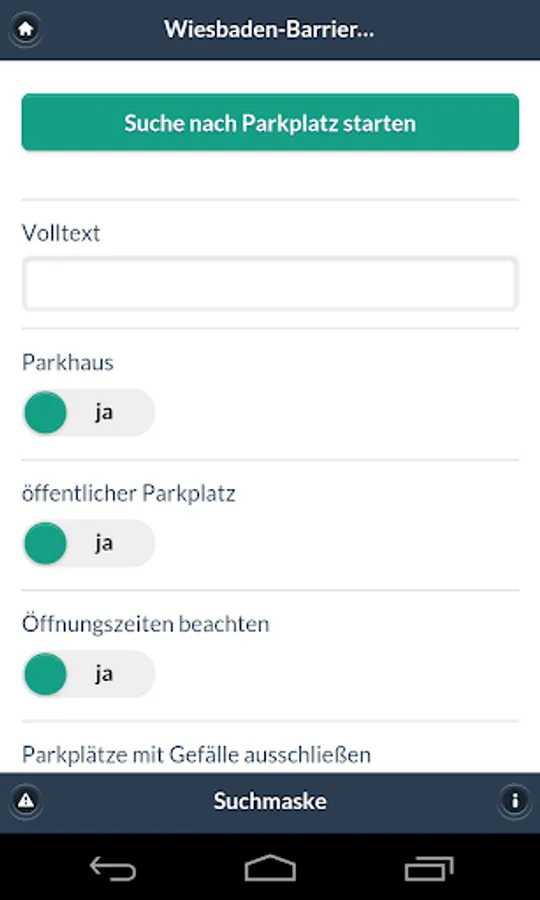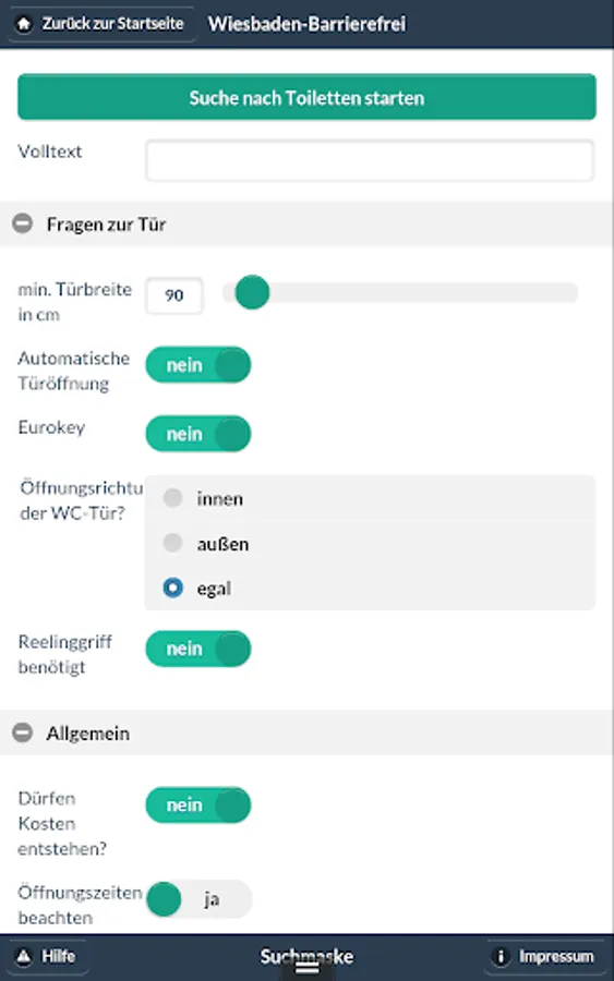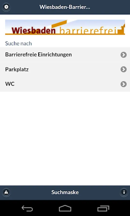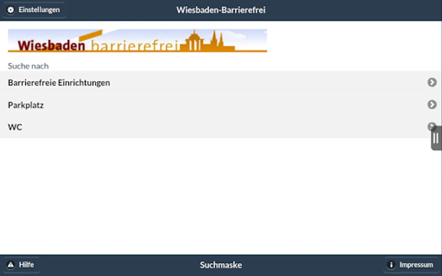 You can use the app within the Wiesbaden city limits Disabled parking in public streets, in car parks, public buildings, as well as display toilets in the public streets and public buildings. It presents detailed information in the form of location, dimensions, opening times and photos. In addition, the app provides information on accessible facilities in Wiesbaden, such as städt. facilities and venues. People with disabilities can thus decide which offer they want to use, and whether the objects are unlimited available for them.