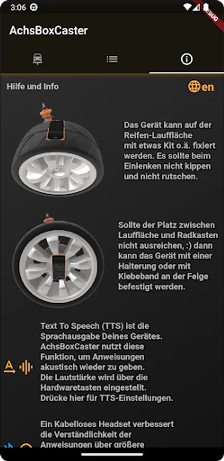 The device is fixed on top of the tire tread or on the outside of the rim. The instructions are issued via TTS voice output and as on-screen text.