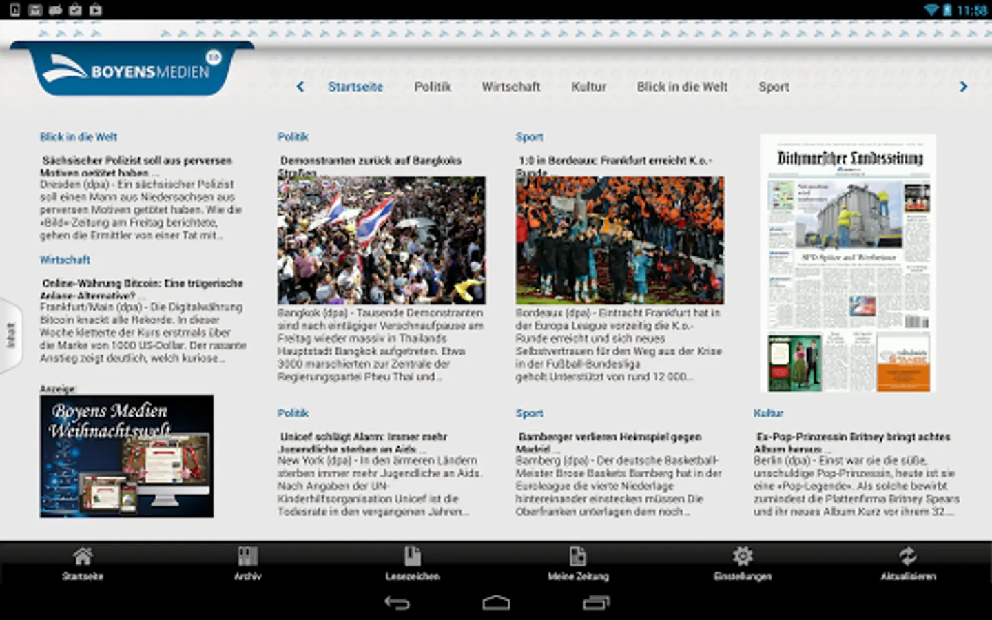 The Boyens media app gives you news for the space Dithmar. You have the ability to read with this app the regional editions of the newspaper Dithmarsch country, Brunsbütteler newspaper, Dithmarsch courier and Marner newspaper. In addition, you will find a free dynamic range. In the dynamic range you will be constantly informed of all important national and international events.