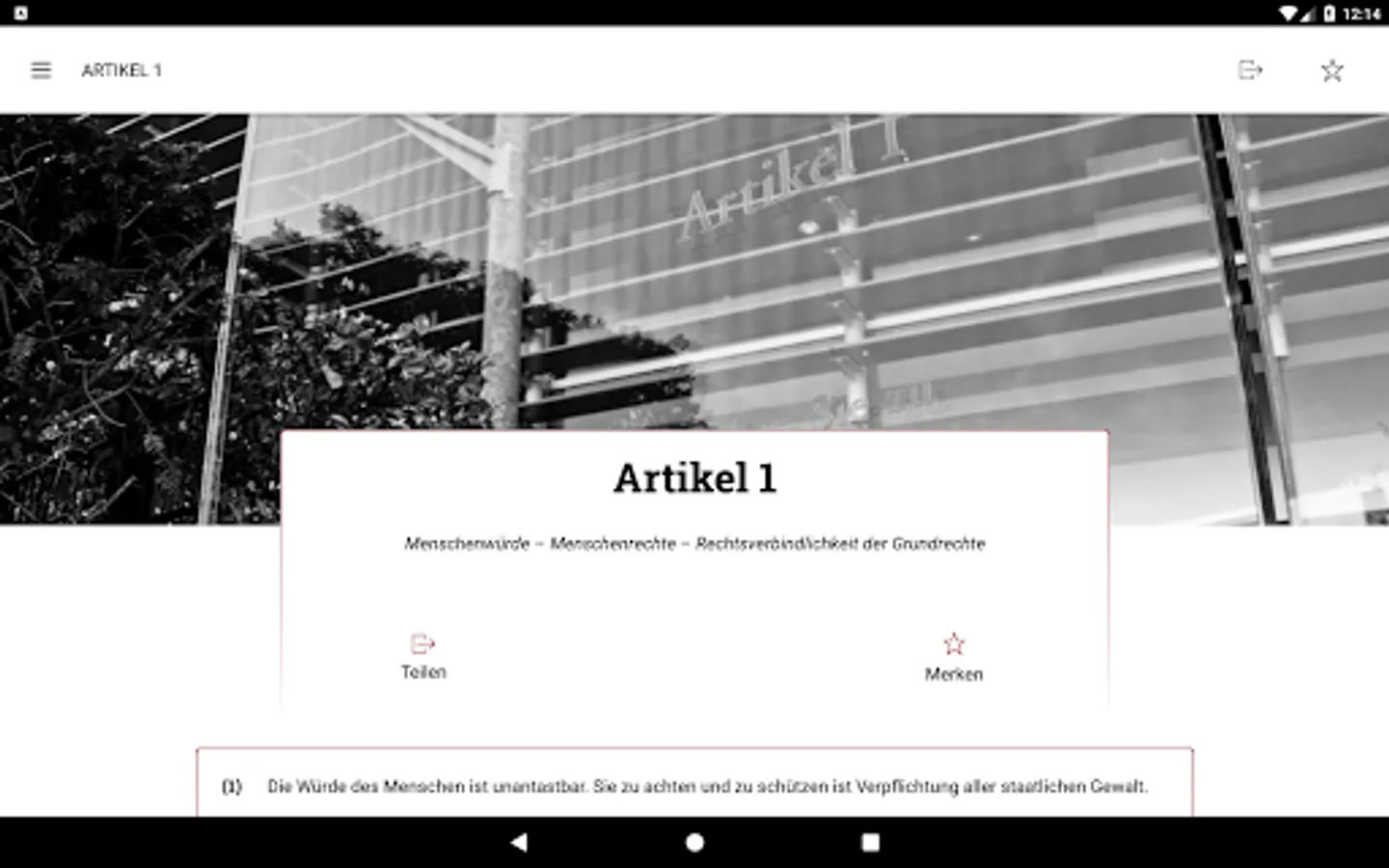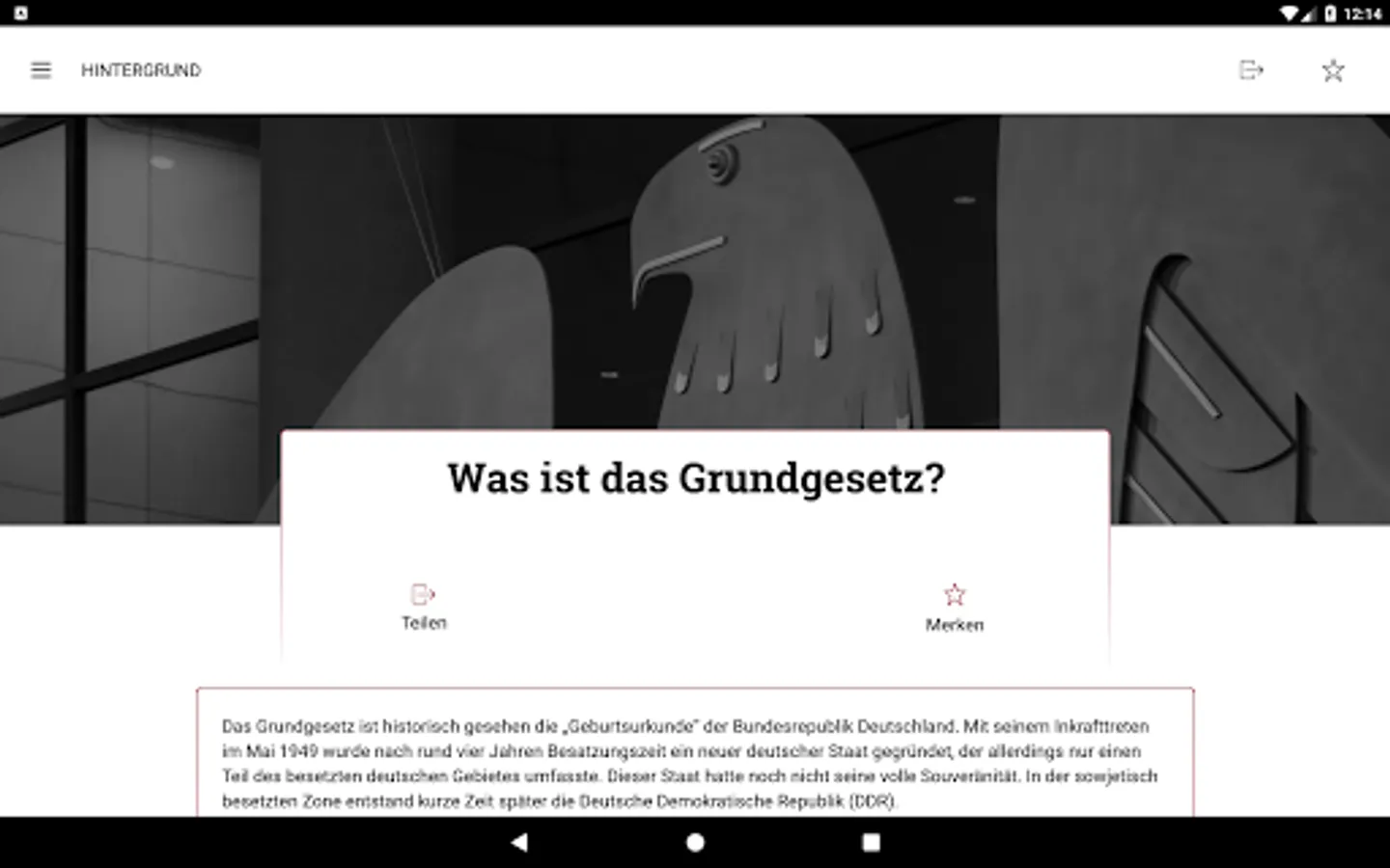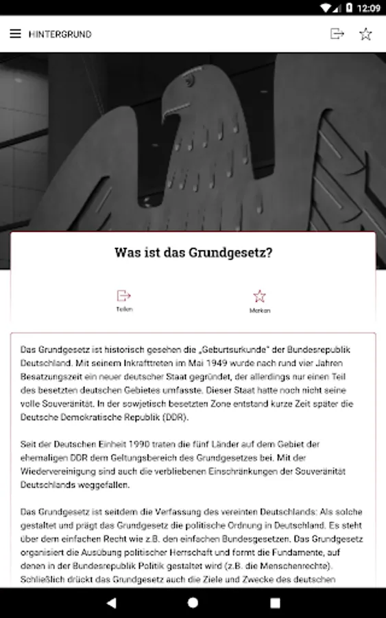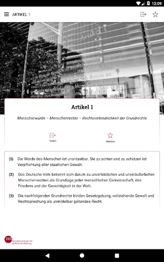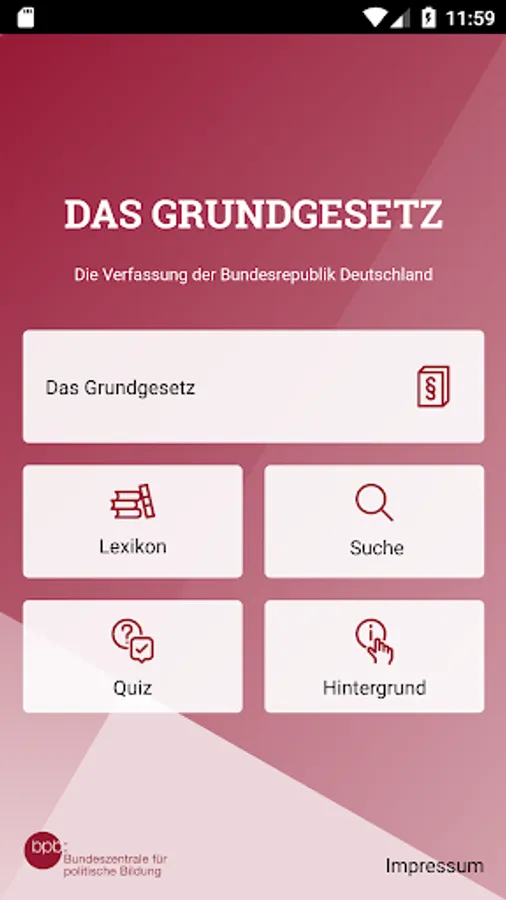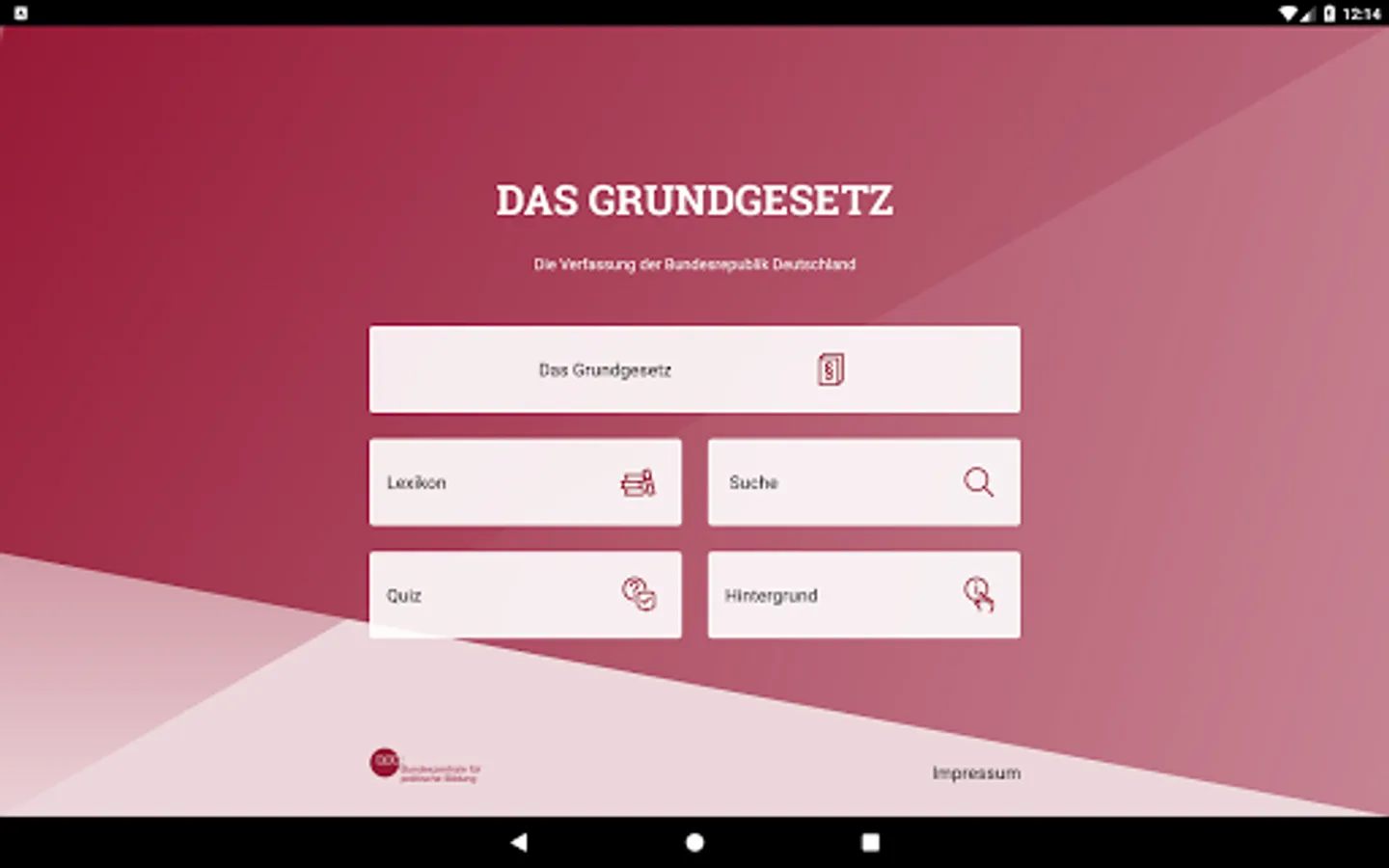 The 14 sections of the Basic Law, a short introductory text is prefixed, which provides a concise overview of the key provisions of the respective section. In addition, the app provides a wealth of background information on the origin and development of the Basic Law. Why is it called basic law and not constitutional? How and when was it decided? How can it be changed?