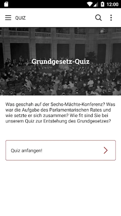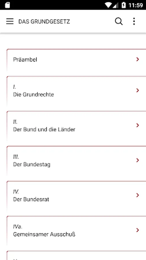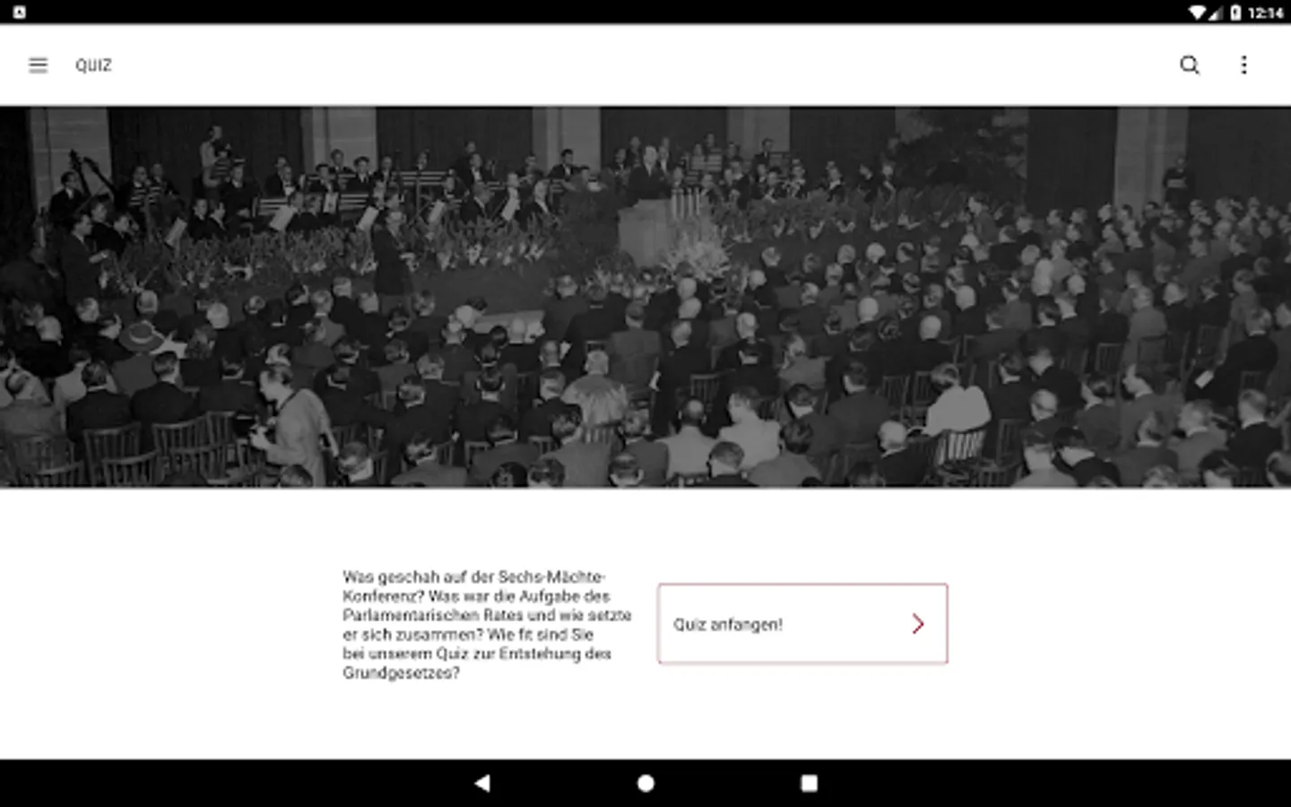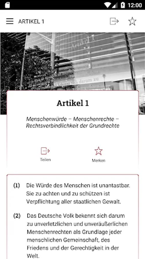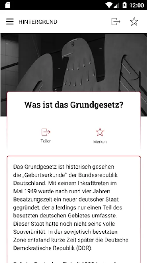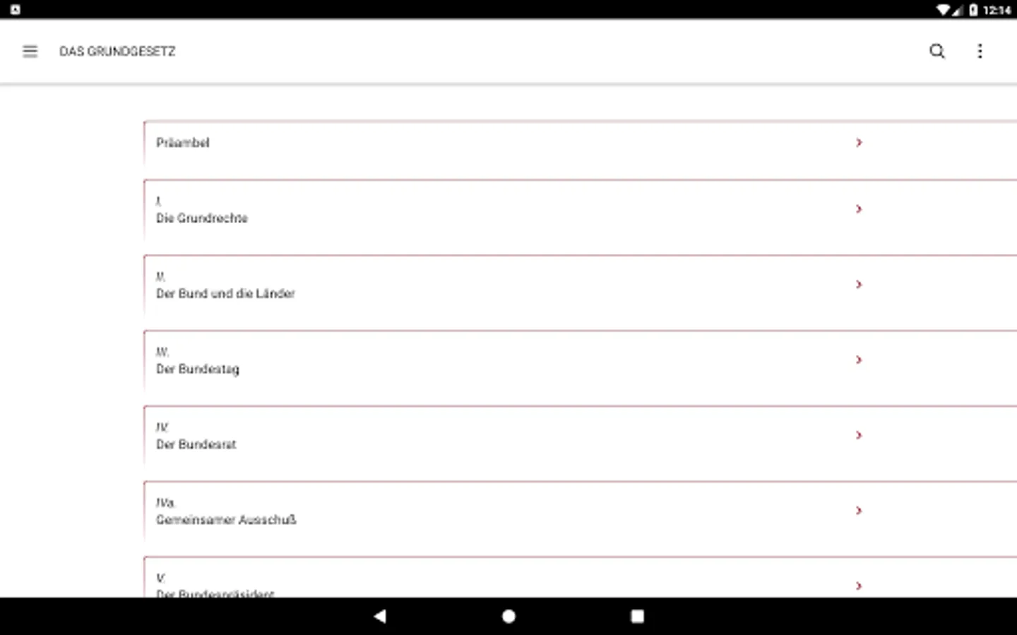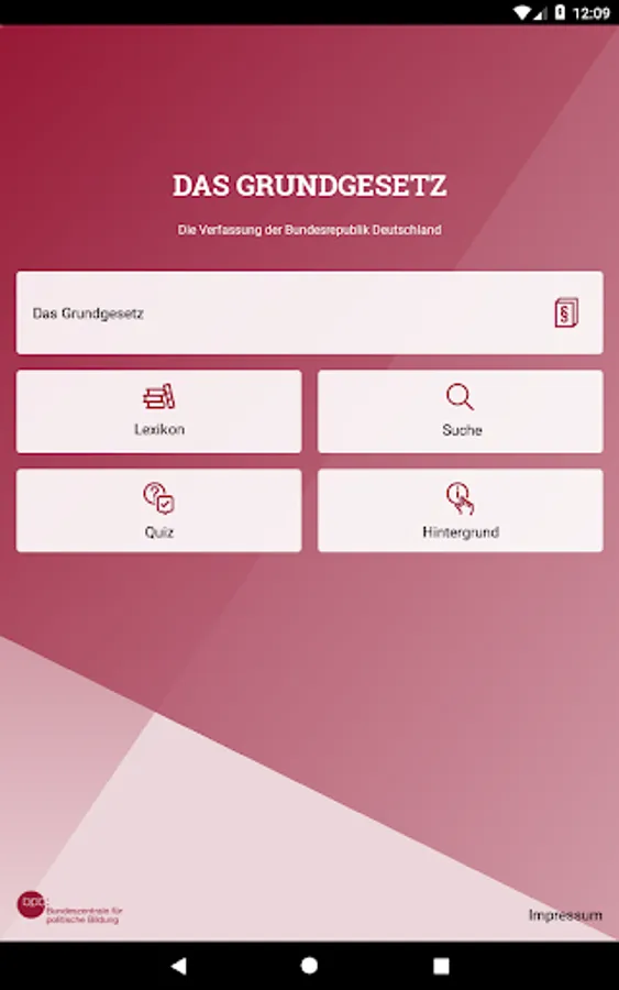 The 14 sections of the Basic Law, a short introductory text is prefixed, which provides a concise overview of the key provisions of the respective section. In addition, the app provides a wealth of background information on the origin and development of the Basic Law. Why is it called basic law and not constitutional? How and when was it decided? How can it be changed?