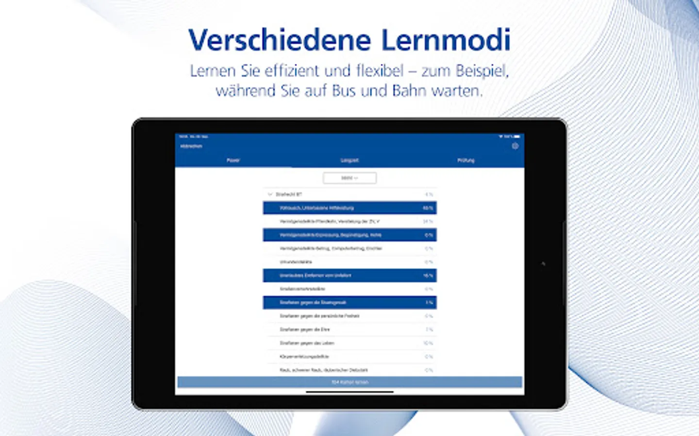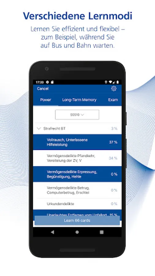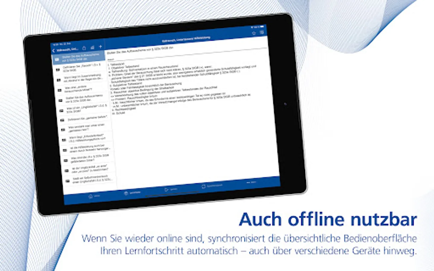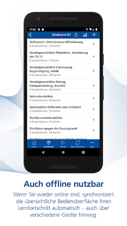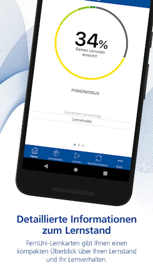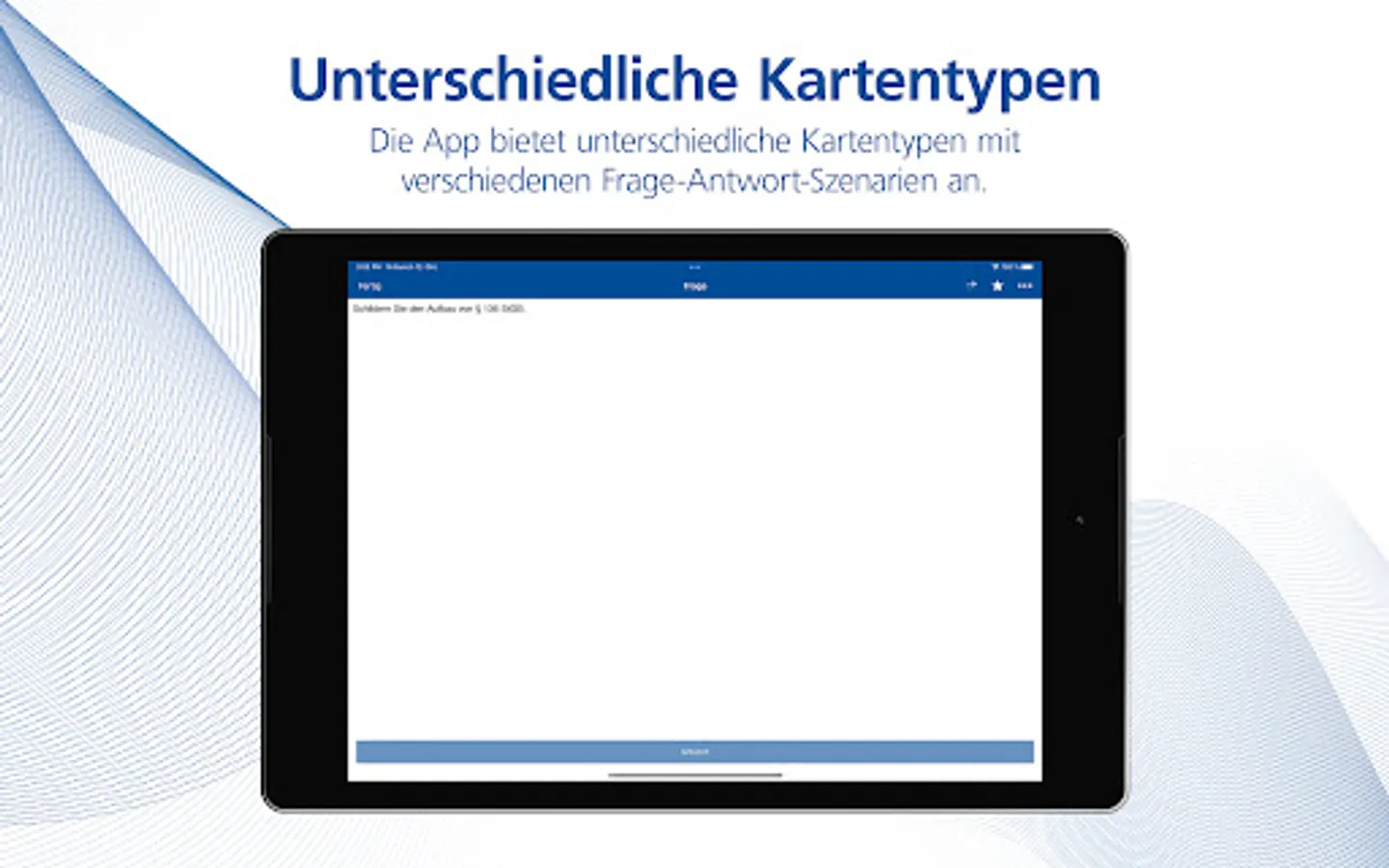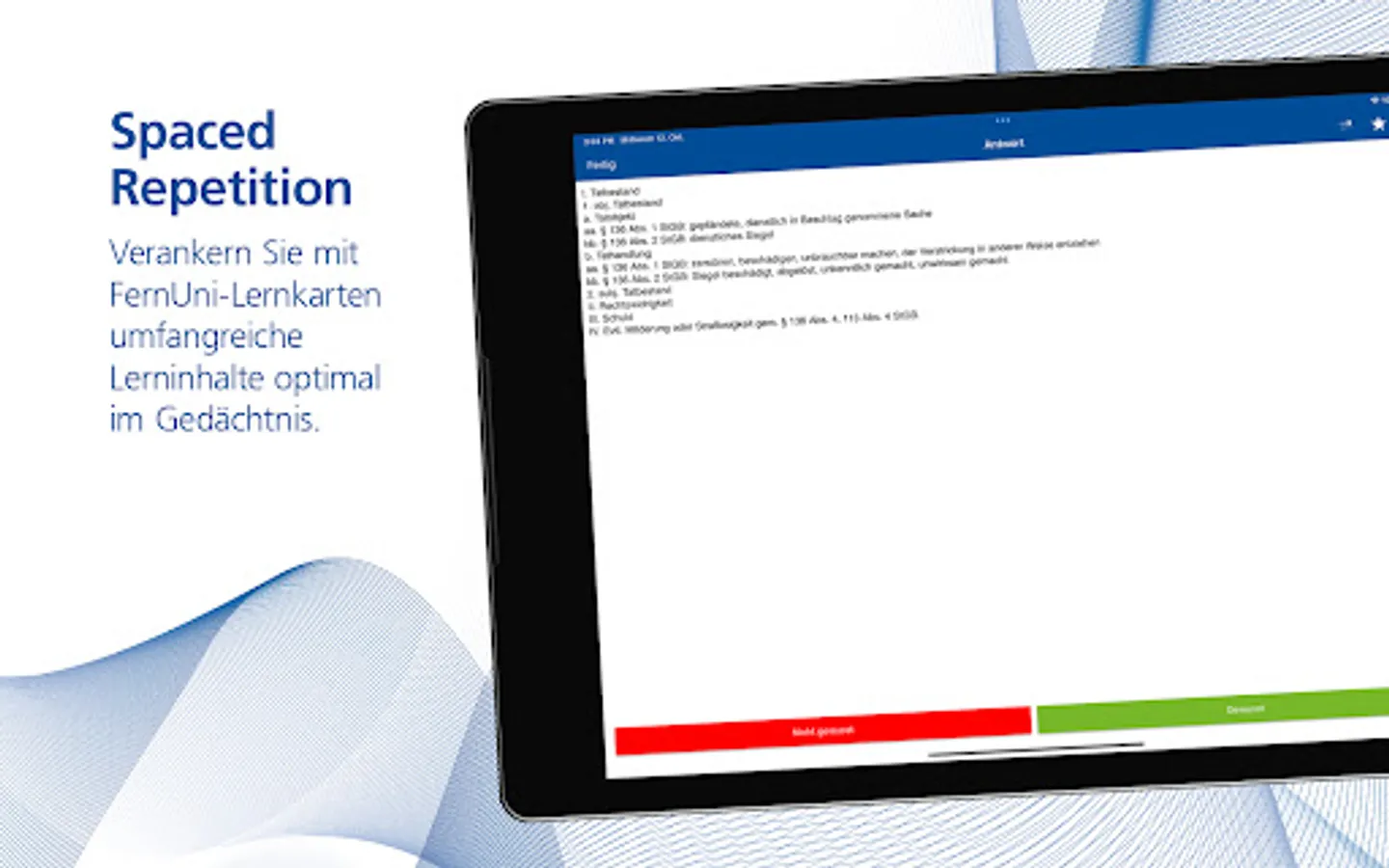 With the FernUni learning card app, you can internalize large amounts of learning content in a particularly efficient and targeted manner. The innovative learning algorithm can adapt to your individual needs and provide you with optimal support while learning. The app gives you feedback on your learning activity and reminds you to review content. Flashcards that have been downloaded can also be learned offline and synchronized with the flashcard servers when connected to the internet. Your module supervisors provide you with the flashcards, which can also be offered as fill-in-the-blank texts, assignments or in multiple-choice format. Audio and video sequences are also possible.