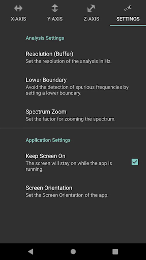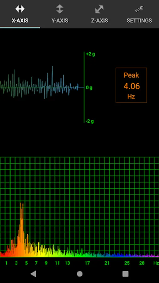 Vibrations visualizes current accelerometer sensor data, performs a Fast Fourier Transformation (FFT) and displays the results in an histogram. The dominant frequency (peak of the histogram) is highlighted. In the settings the accuracy of the fft can be adjusted in a range from 0.0625 Hz - 1.0 Hz. Results are shown in a separate tab for each axis.