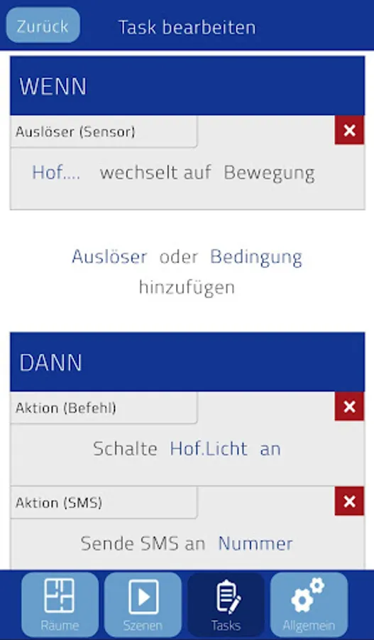 Configurable tasks can be set up. For example, when Motion is detected in the hall is switched to light in the corridor. It can also create tasks that not only turn, but notify via e-mail, push message, or SMS when a new event. Customize your home easily to your everyday habits.