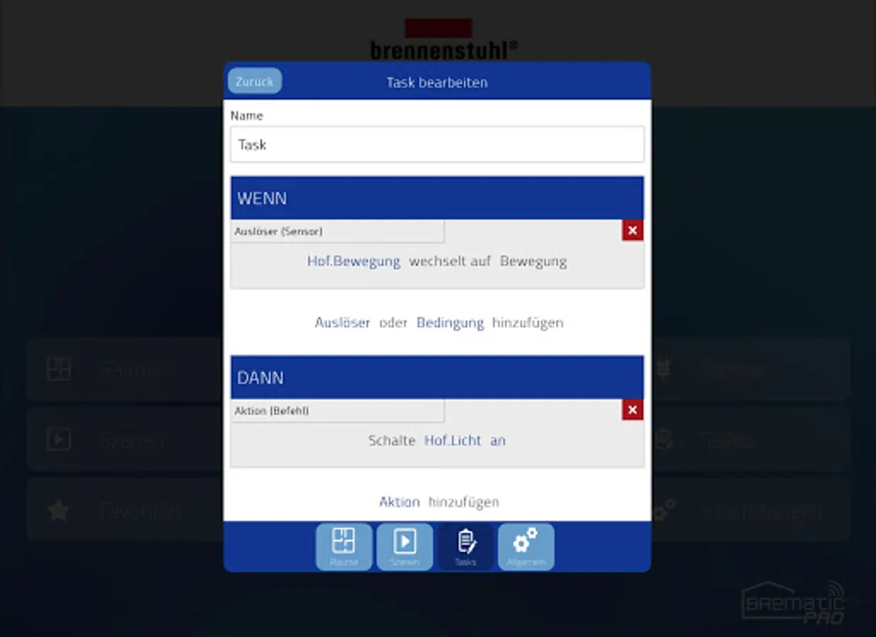 BrematicPRO also helps when it comes to safety. Are you, for example, on vacation, can be freely configured via the ALARM task conditions under which an alarm should be triggered. You can send an email or push message or establish that the outdoor siren will be activated when an alarm. So you have in the absence of your home by remote monitoring via smartphone / tablet always in view.