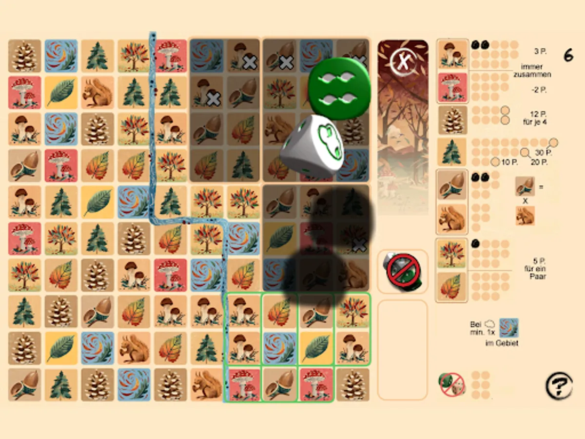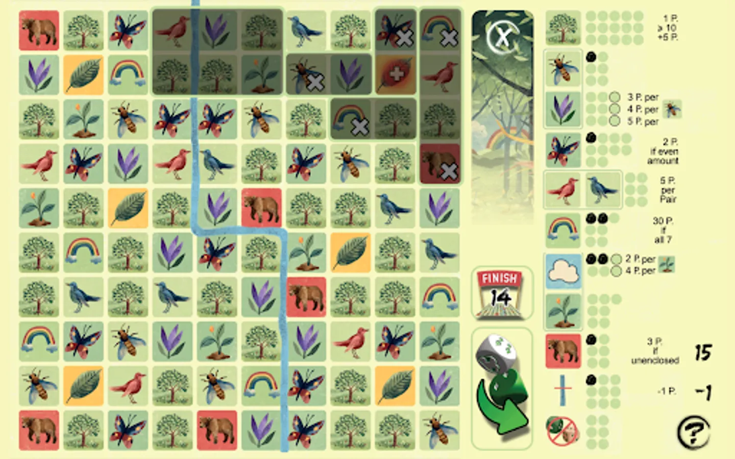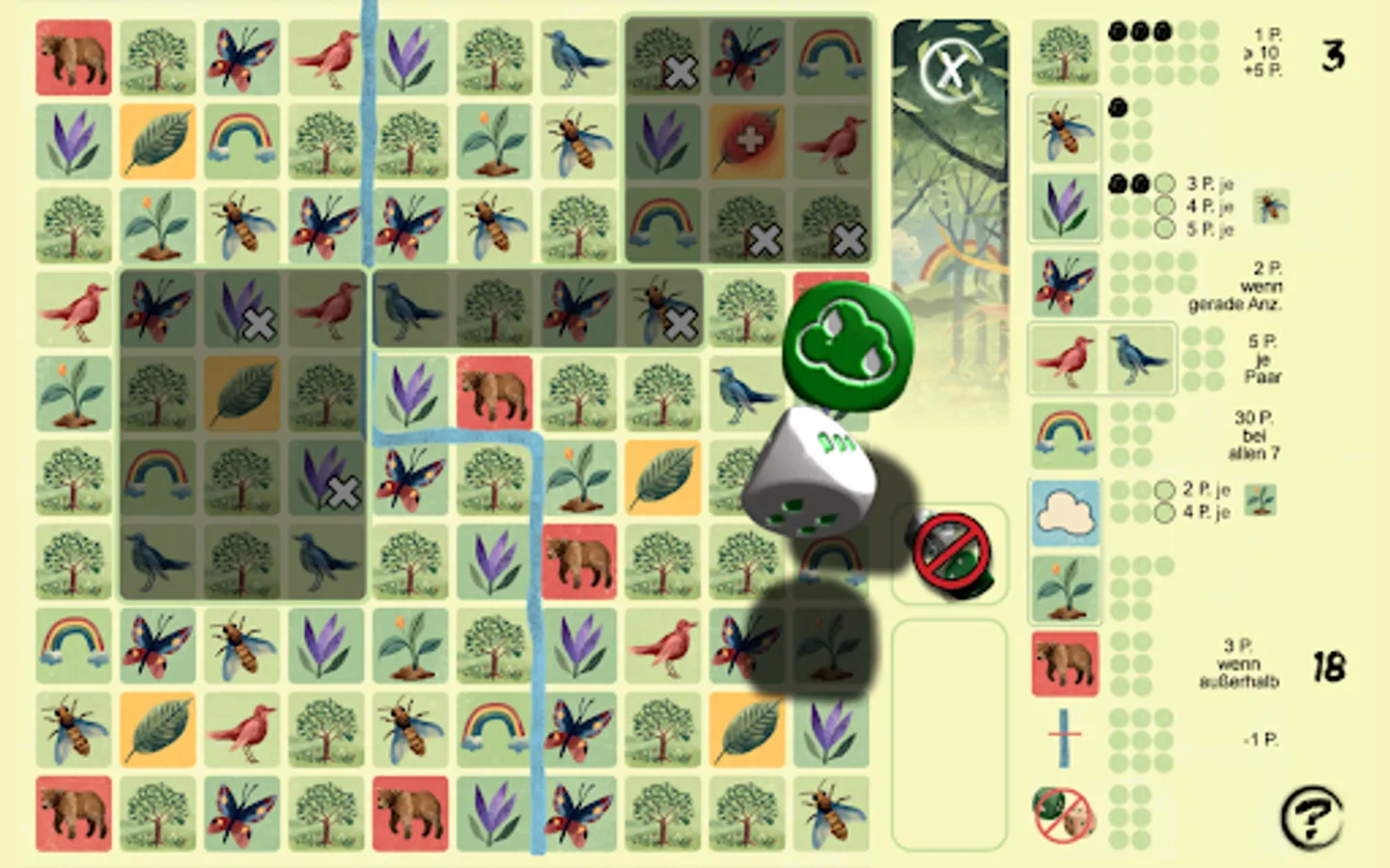The game is very simple. 2 dice are thrown. The numbers on the dice determine the size of the fields to be marked. Now select a forest symbol to be included in the scoring and the next move is made. Thanks to the cleverly designed game plans and the matching scoring rules, this simple principle always results in new exciting decisions. Most of the time, you have the choice between safe points and a riskier variant, which allows you to score significantly more points, but only if there are still suitable rolls afterwards. Here you have to decide wisely!