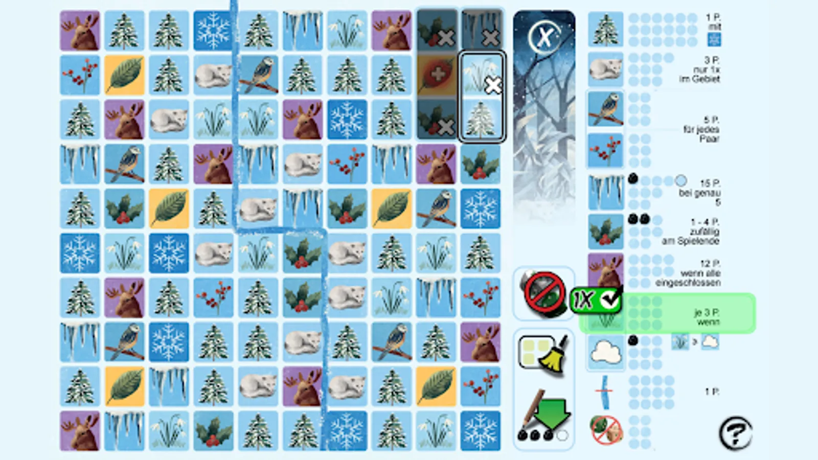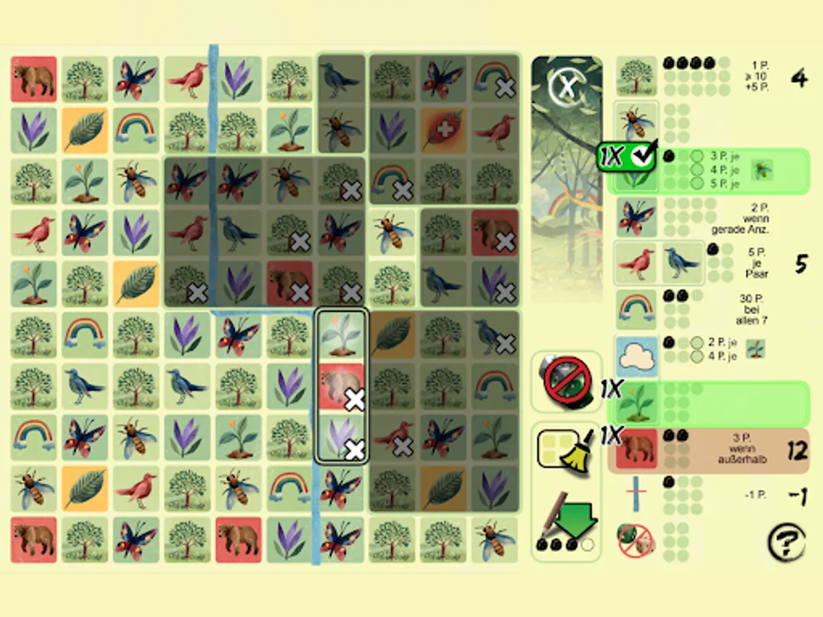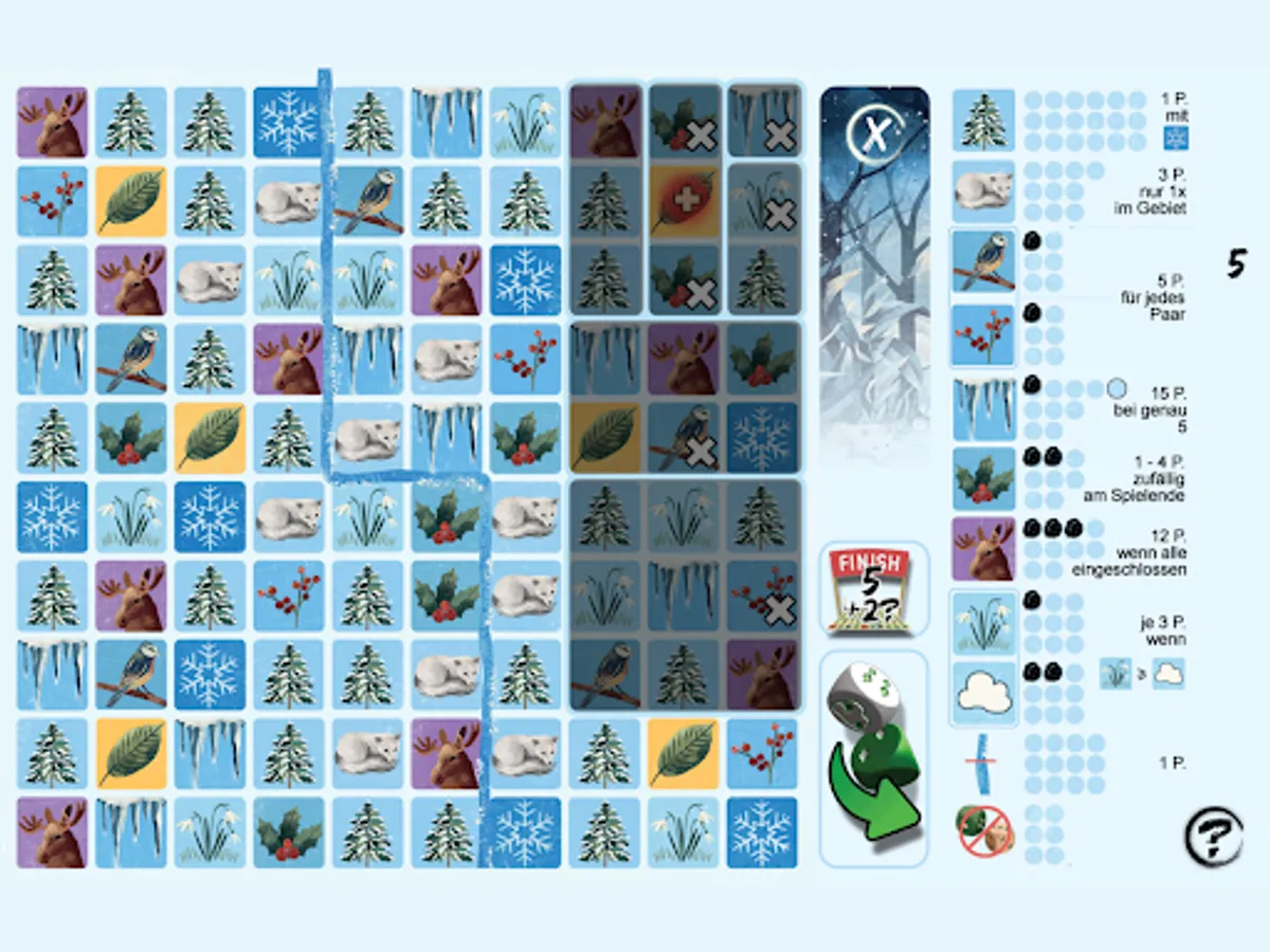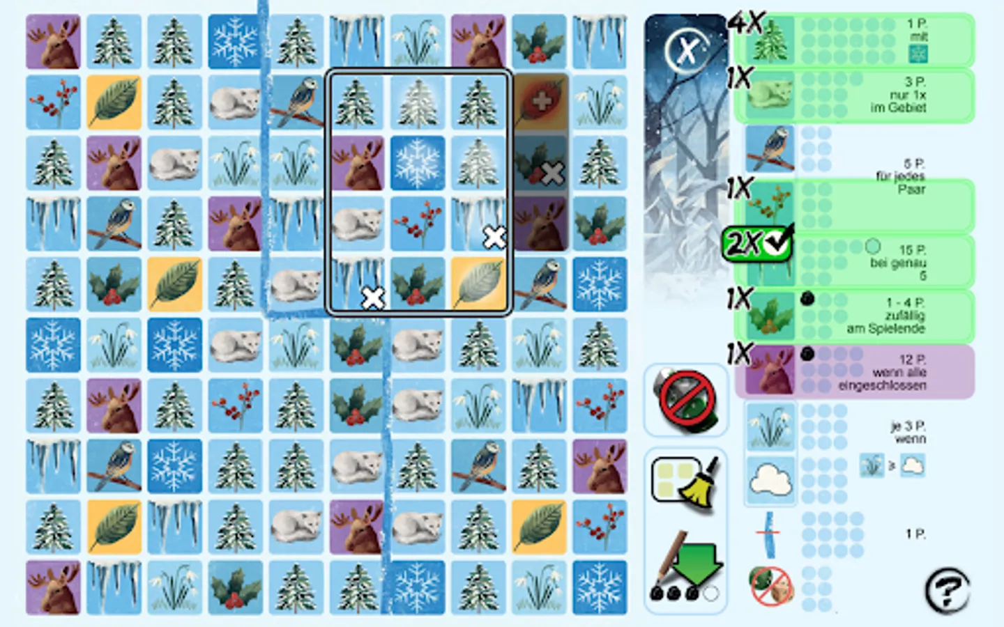 The game is very simple. 2 dice are thrown. The numbers on the dice determine the size of the fields to be marked. Now select a forest symbol to be included in the scoring and the next move is made. Thanks to the cleverly designed game plans and the matching scoring rules, this simple principle always results in new exciting decisions. Most of the time, you have the choice between safe points and a riskier variant, which allows you to score significantly more points, but only if there are still suitable rolls afterwards. Here you have to decide wisely!