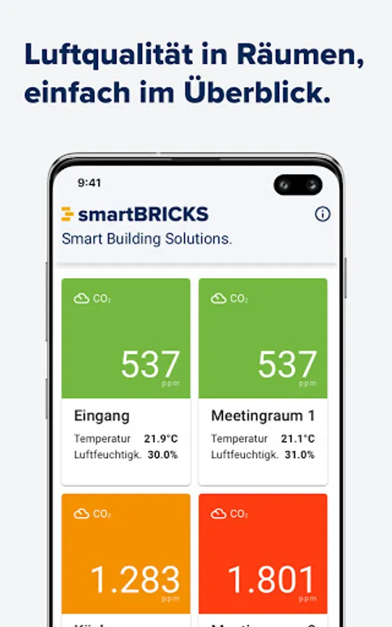- Overview of measured values - Overview of the current measured values of all possible sensors on the dashboard. The colored design of the entries allows you to quickly determine which rooms need to be ventilated.