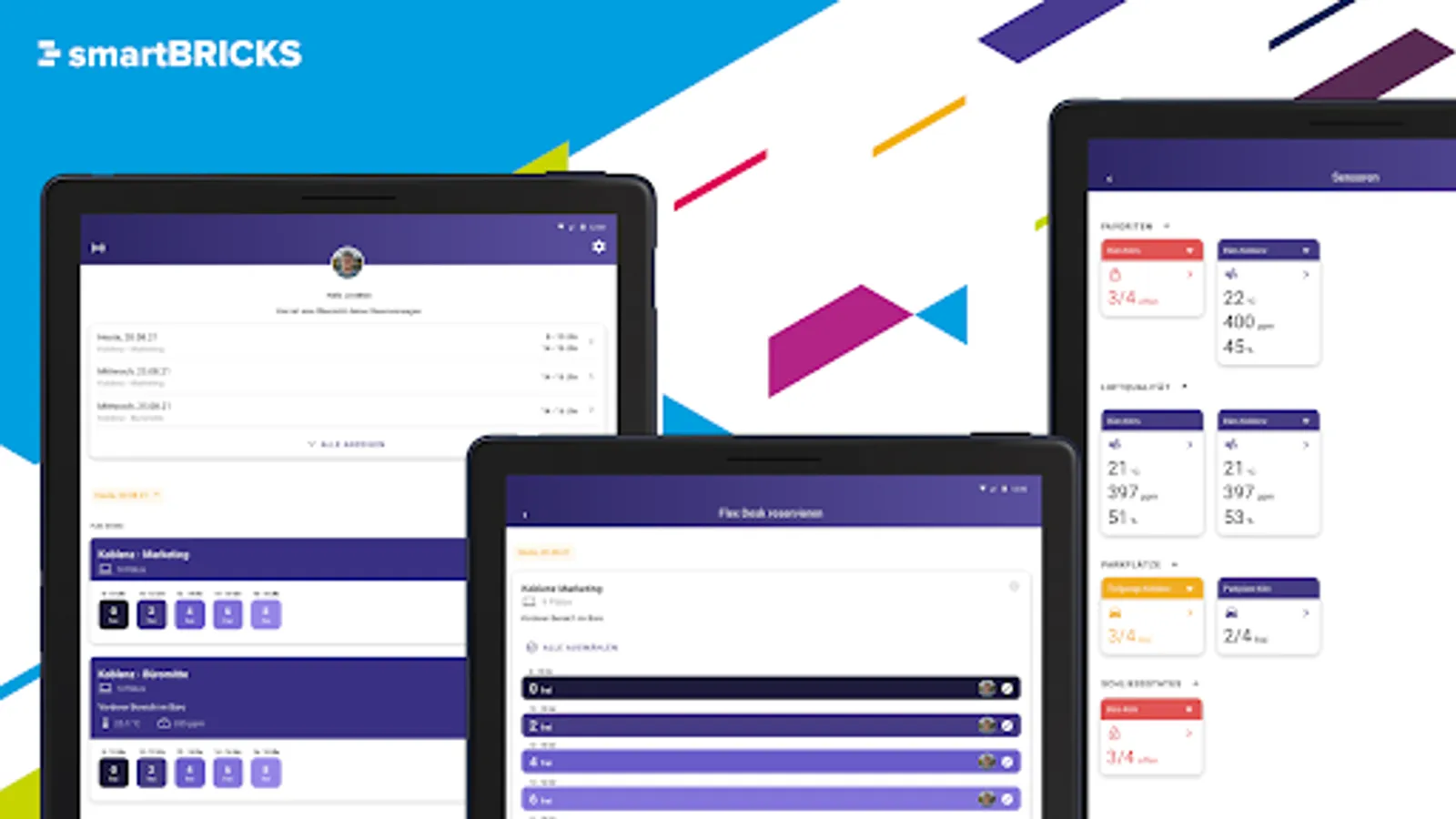 smartBRICKS simplifies hybrid work in the office and enables individual, use-case-related representation for the most diverse roles of users. Mobile workers can book a workspace as needed before visiting the office. The sensor-supported app offers various interaction options for everyone present in the office. This way, you can see at a glance which meeting room is free, ghost meetings are detected and avoided by sensors, the locking status of doors and windows can be viewed easily, or the number of people per office building is recorded. smartBRICKS has a modular structure so that the view can be uniquely combined depending on the role of the user. It can be decided whether employees should receive different information than the cleaning staff or housekeeping or whether the application should be used as an info view in meeting rooms.