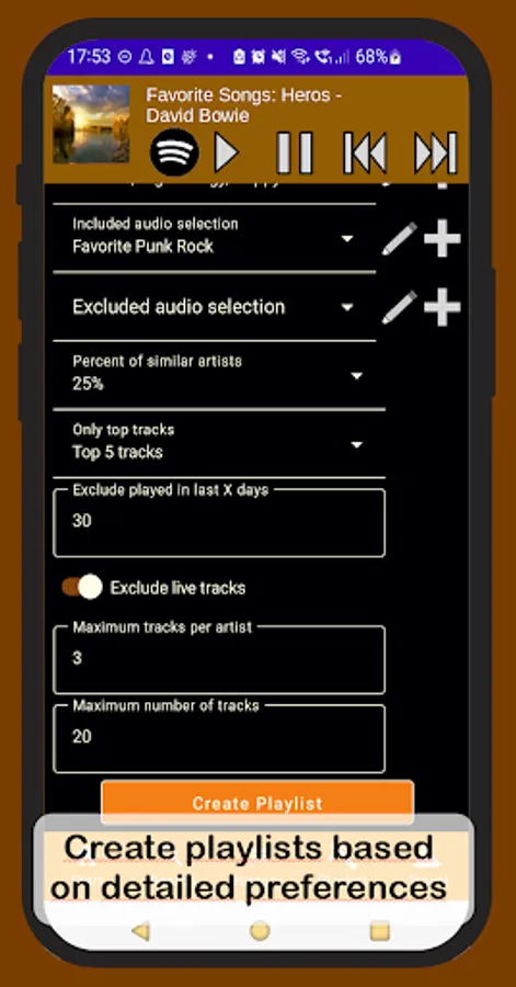 Create playlists based on the data of the app "Hot Sauce for Spotify". The playlist generation considers: