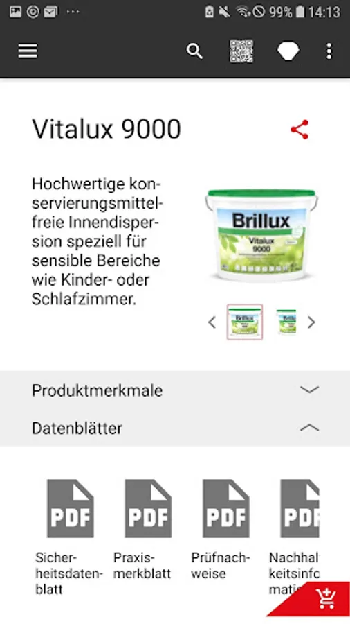 Here you will find descriptions and information on the Brillux products, divided into the various ranges. Using the search function or the code scanner, all technical information and data sheets and product videos can be displayed in no time at all and, if desired, sent by email. Business customers can use the shopping cart to order all products - as standard goods or tinted using the Brillux color system - to the workshop or directly to the construction site. Depending on the language and region settings in the iOS operating system, the various national product ranges are loaded into the app in the appropriate language during the online update.