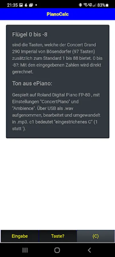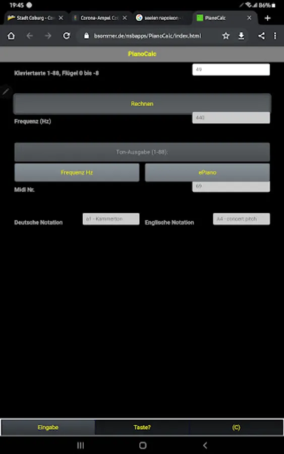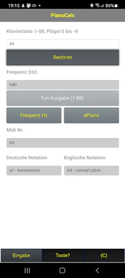 Enter the number of a piano key. E.g. 49. You will find out the frequency (Hz), the midi number and the German and English notation. The tone of the frequency and the tone of this piano key on an ePiano can be output.