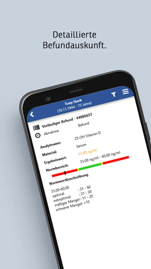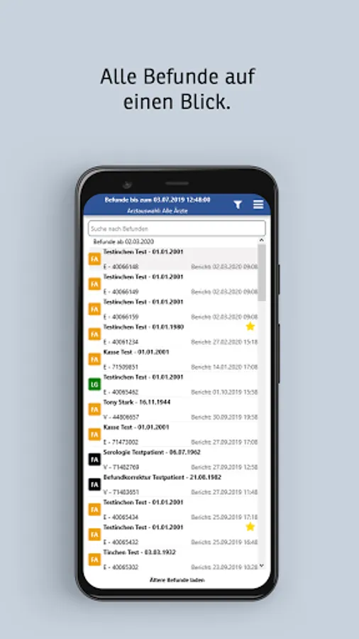 Various filter, search and sort options are available for a quick overview and structured insight. Pathological findings are clearly emphasized.