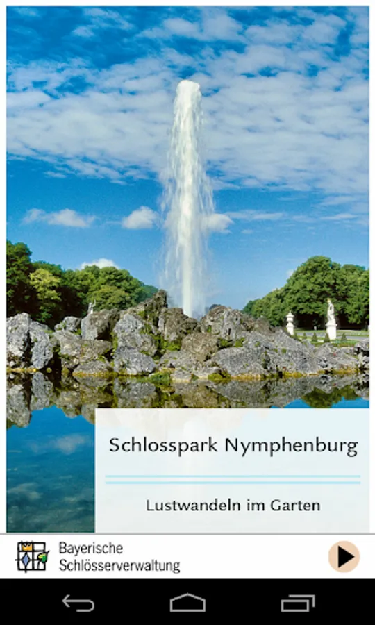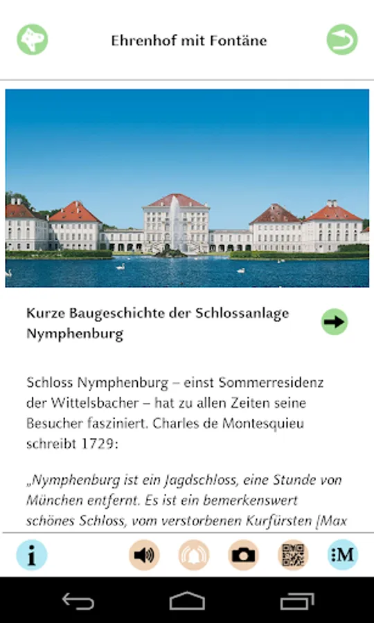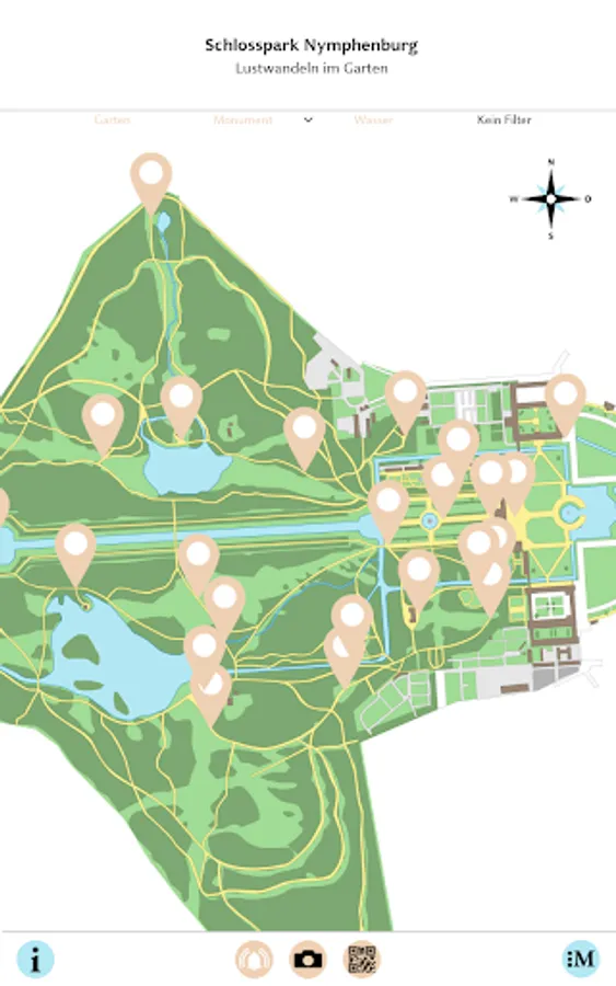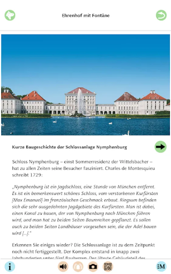 The application "Schloss Nymphenburg" is your companion for exploring this historic park in Munich. At 23 selected stations for information on the history and Hördokumente, pictures and movies to your particular location. All texts are available in the app as audio files.