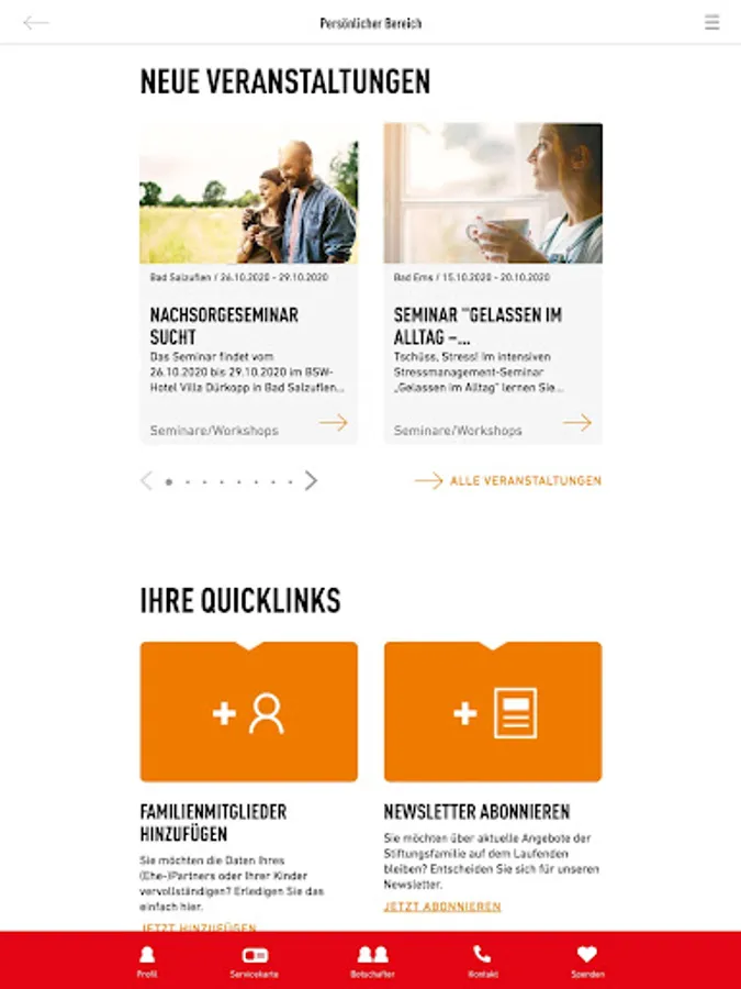 Whether at home or on the go: thanks to our app, you always have the support of the foundation family at your fingertips as a member. Regardless of whether you spontaneously need support and advice on a topic or are looking for offers in the areas of leisure or travel. You also always have your service card ready in the app.