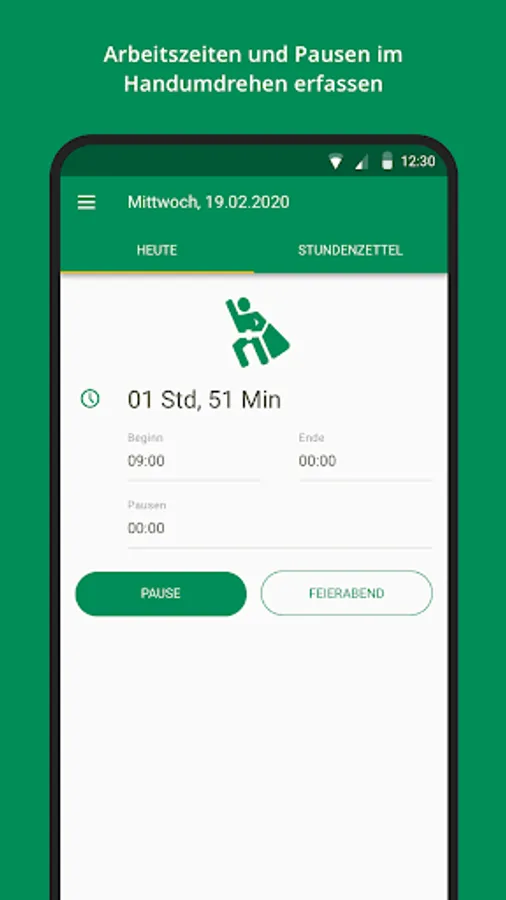 - Easily record working hours and breaks. Start, after work, done