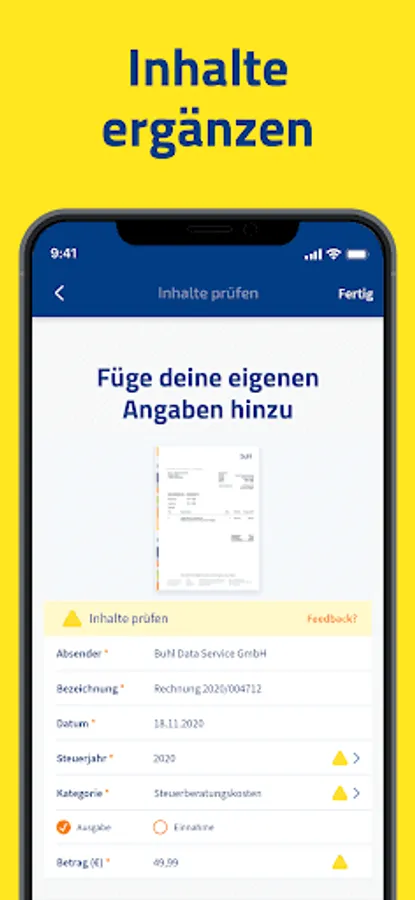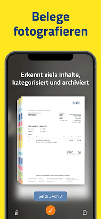 The tax box tries to automatically recognize the important content of your receipts. For example the amount or sender of an invoice. The appropriate tax category is also determined, e.g. office supplies or craftsmanship.