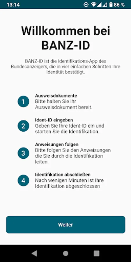 The Bundesanzeiger Verlag offers this service for its tasks, in particular the transparency register, and for its partners, for which an identity check of the customers must be carried out in order to comply with legal requirements or to guarantee security with regard to the identity of the customers.