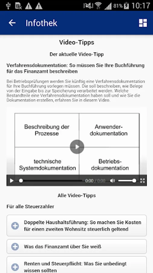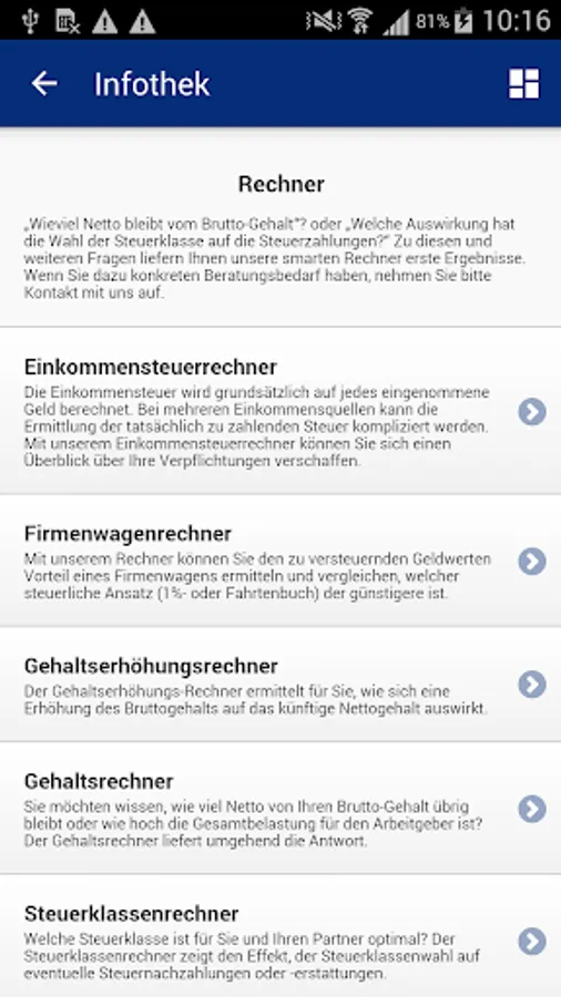 Also on selected tax issues, the app keeps ready information: What is important in running a logbook? What are the possibilities of tax-privileged content employee benefits are there? For these and other topics, the app provides you with the answers.