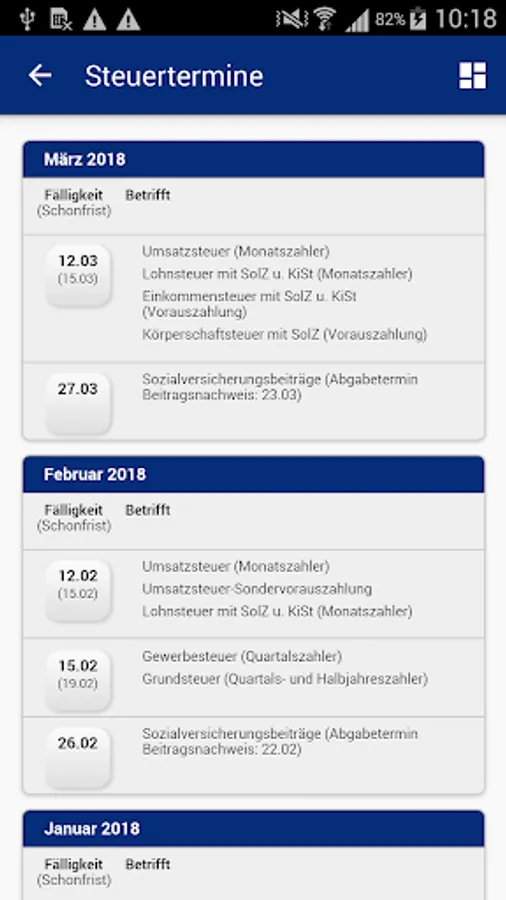 You want to know, when that tax payment dates? Whether, for example, Income tax or sales tax deduction, income tax or business tax - in the app you can find the corresponding dates.