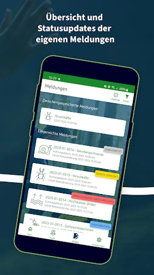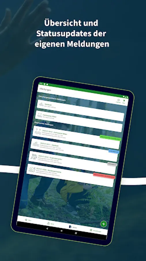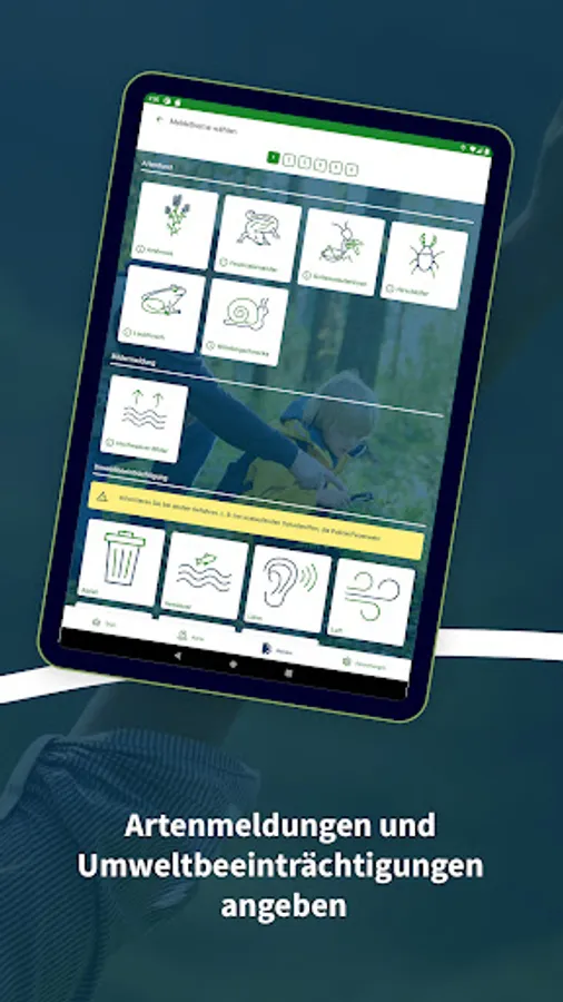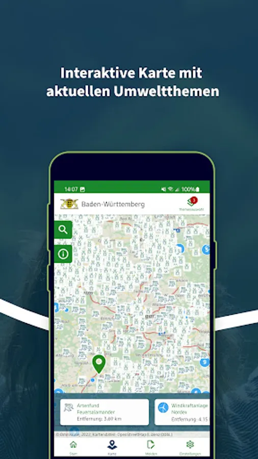 With the My Environment app, you can also actively support the environment yourself by documenting environmental damage and species discoveries with your mobile device and sending them to us using the "Send message" function.