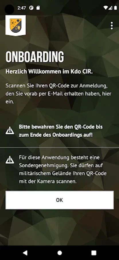 Onboarding assistant for additional soldiers in the KdoCIR / Bundeswehr. This application is in the experimental phase, the user group is determined by the KdoCIR. Users receive an access code to use the app from KdoCIR.