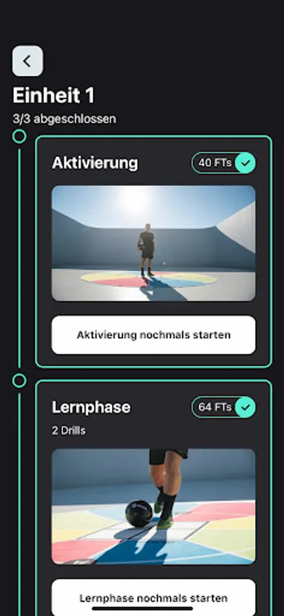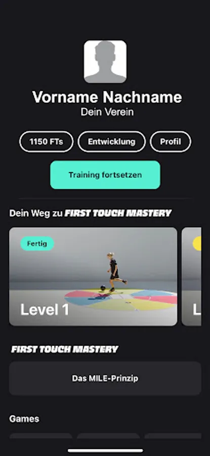 The focus of the training takes place on the FT360 circle. The FT360 app in connection with the FT360 circle creates a training concept that is unique on the market in this way. We offer you more than 40 training units over 10 levels. Each training unit consists of 4 to 5 training exercises on the FT360 circle, so-called drills. In each training unit you will find an activation drill, learning drills and a challenge. In addition, you can always play our FT360 games between the training sessions to achieve better learning success. Step by step you go your way to First Touch Mastery.