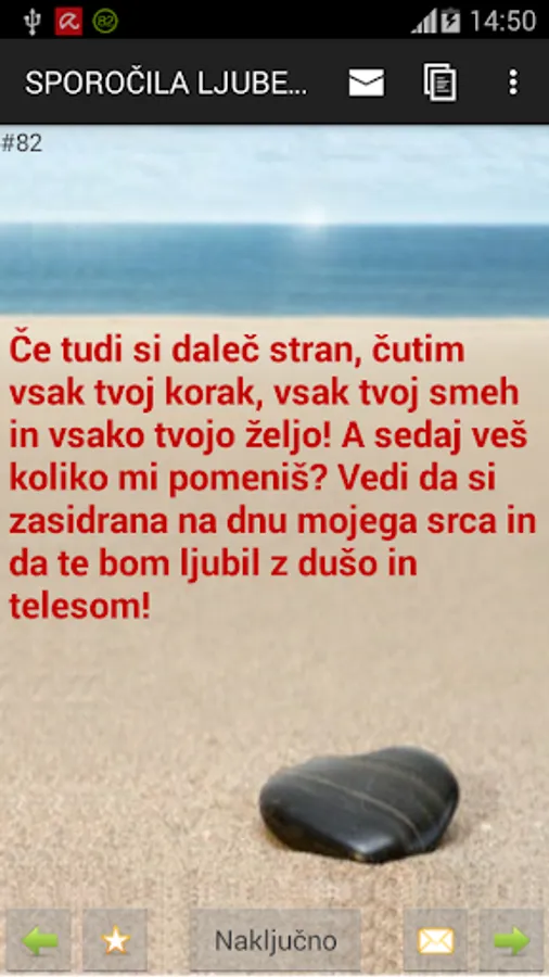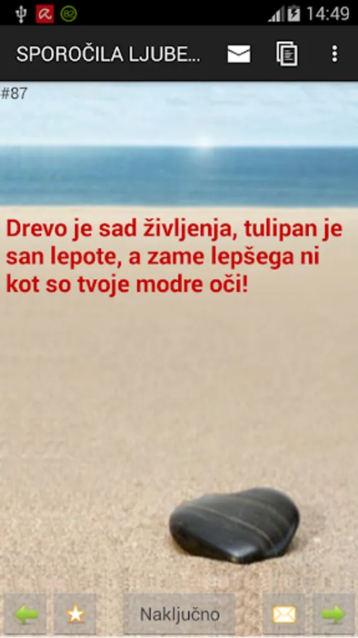 The application provides you with a love message appropriate for every day. It contains all kinds of verses, proverbs, sayings, messages which you can share with your partner. Share them via SMS, E-mail, Facebook and WhatsApp applications. Brighten up the day of your partner and surprise him with a love message and that every day! Carefully selected verses of love will brighten the day of both you and your partner, let the words reveal what is in your heart. When the words I love you is not enough to describe your affection is here for you application that helps you express what you feel to your partner. Verses and messages are more than suitable for anniversaries, personal holidays and Valentine's Day.
