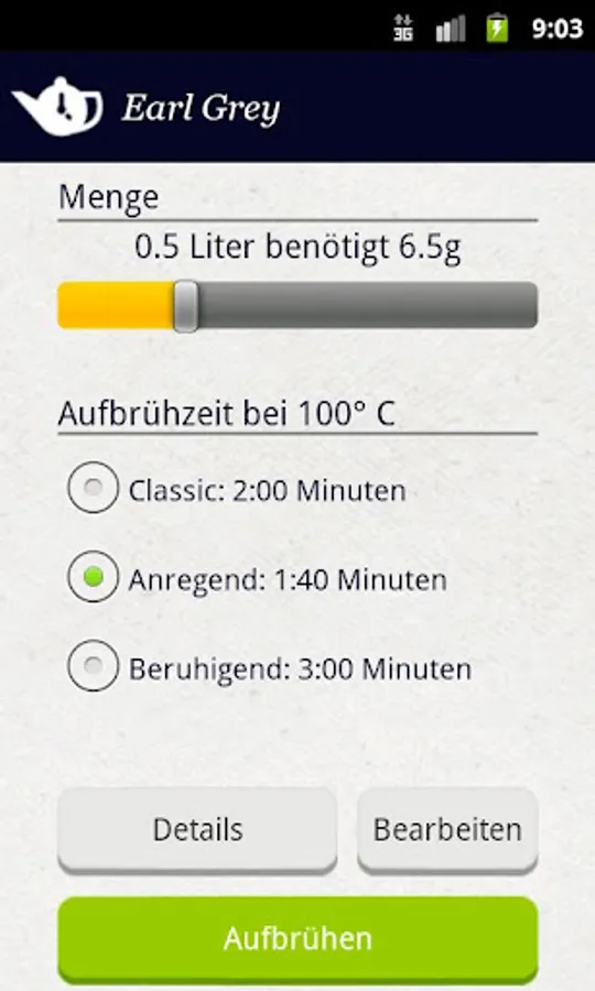 Making a fine tea means getting water temperature, quantity of leaves, and brewing time just right. Who has not been unsure about the exact procedure before? TeaTimer provides the perfect settings for a wide choice of teas and makes sure you don’t miss the right moment to enjoy a nice cup of tea.