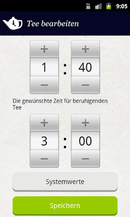 TeaTimer lets you have it your way: select your favorite teas for quick access or change the values for temperature, amount or duration to match your personal preferences. You can also add your own teas to the database.