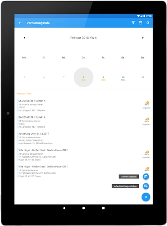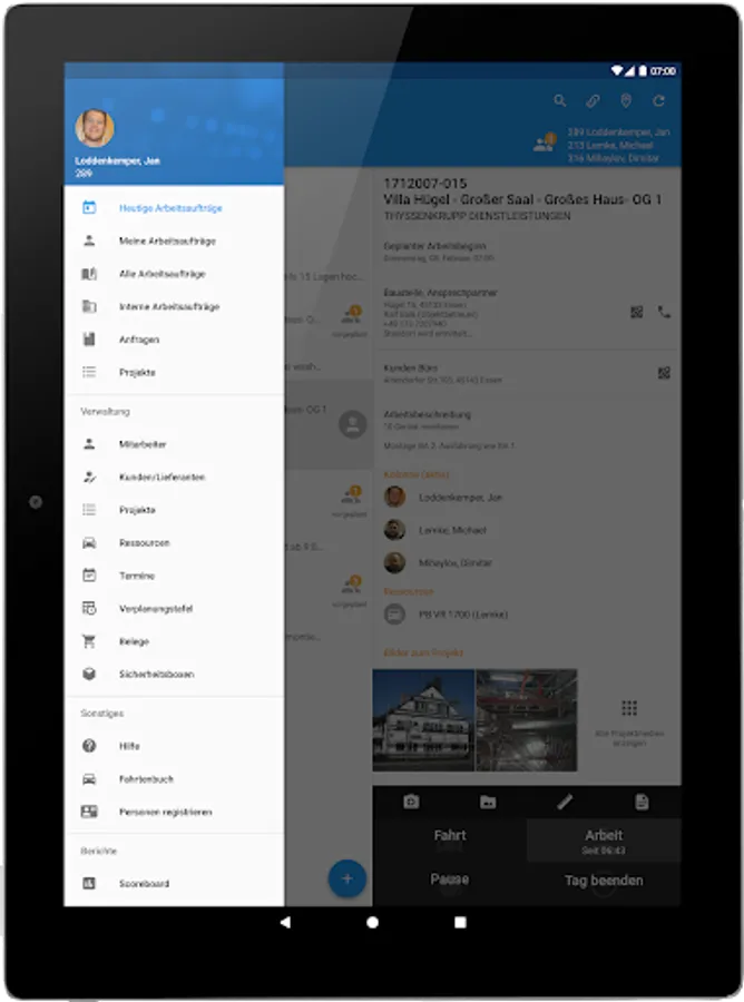 The work orders assigned to the respective projects and thus also the basis for timekeeping and the construction documentation. A precise daily scheduling and planning column is possible. Similarly, a risk assessment can be deposited.