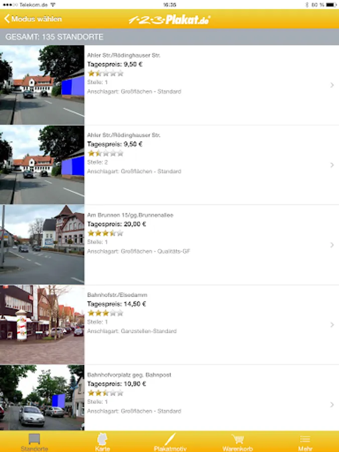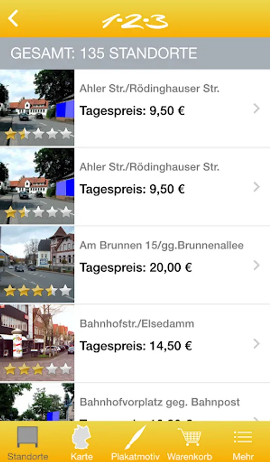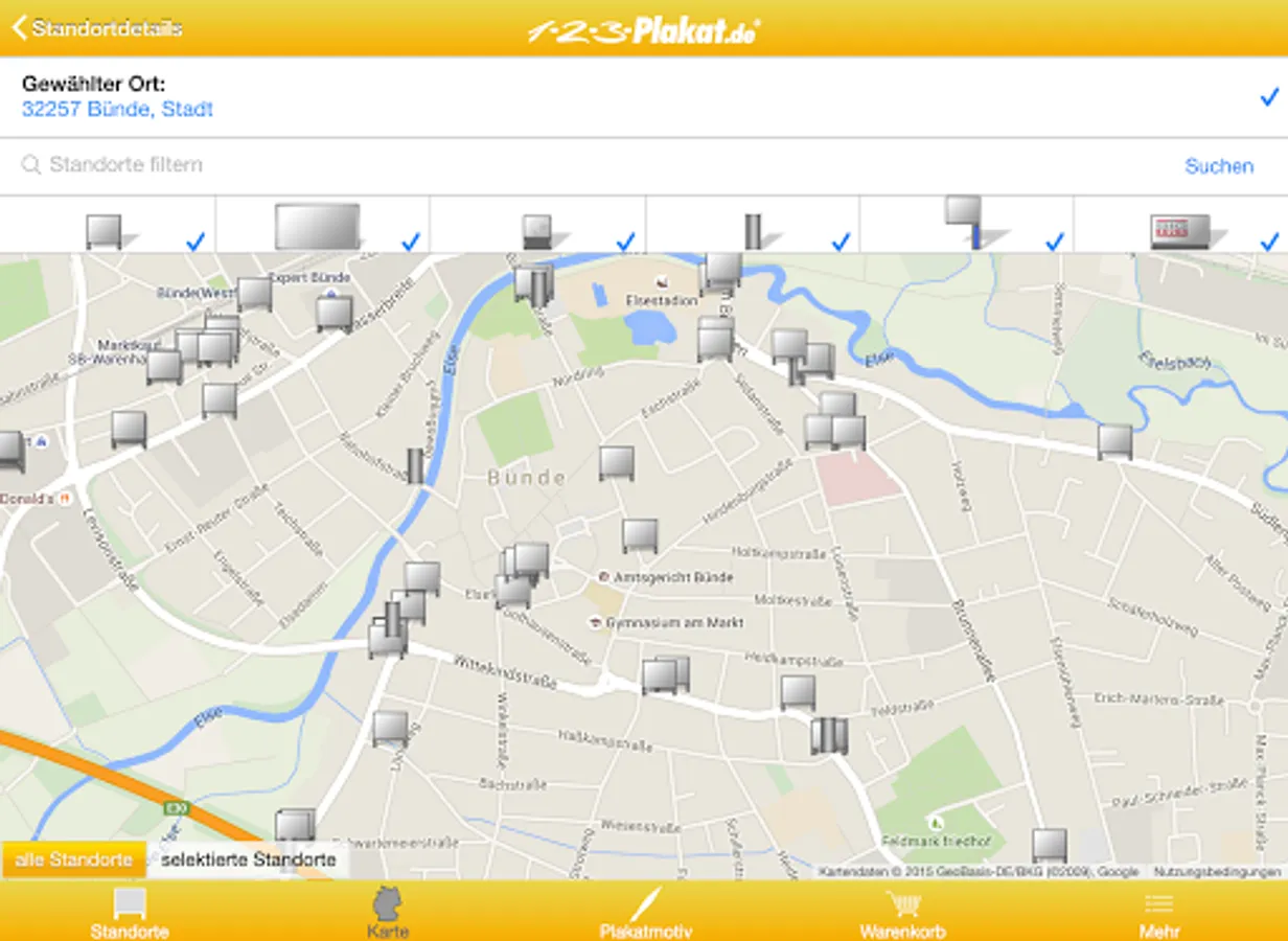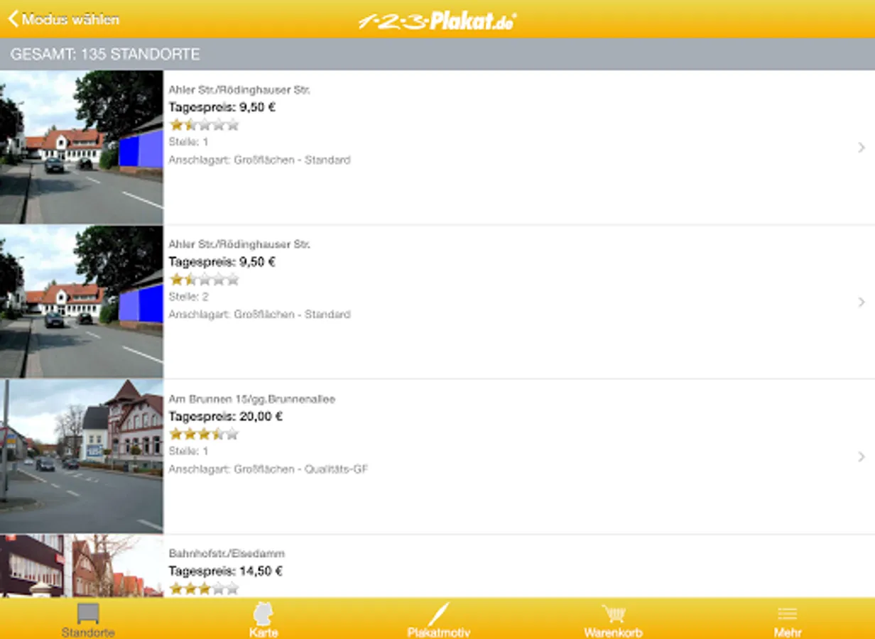 1-2-3-Plakat.de is a mobile platform for Germany-wide billboards. The program offers direct access to all 180,000 large area billboards throughout Germany. The locations are backed with photos, descriptions, availability and rental rates today. You can book the sites directly and give the poster the same with in order. Thus your outdoor advertising campaign is posted in a few minutes.