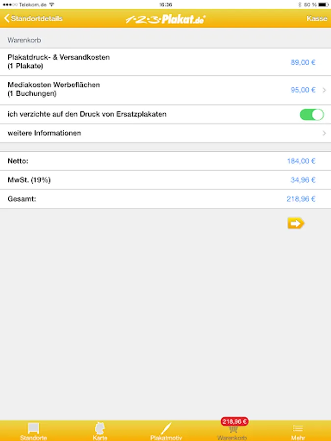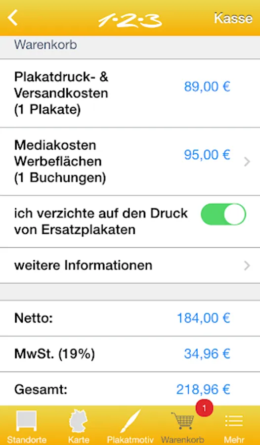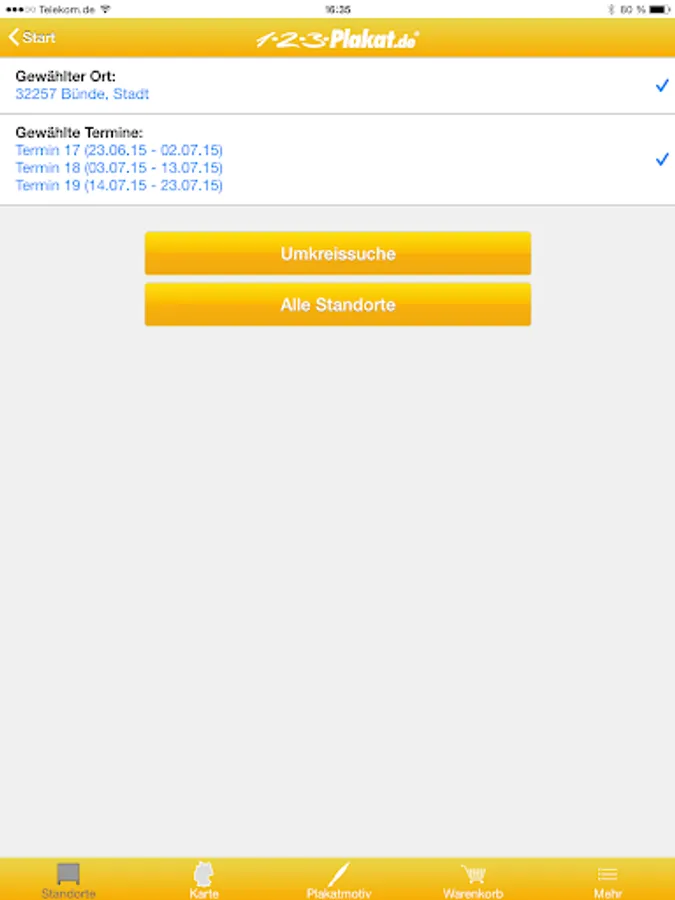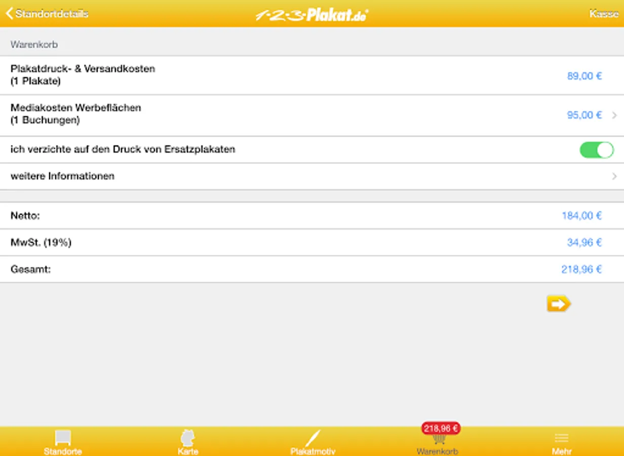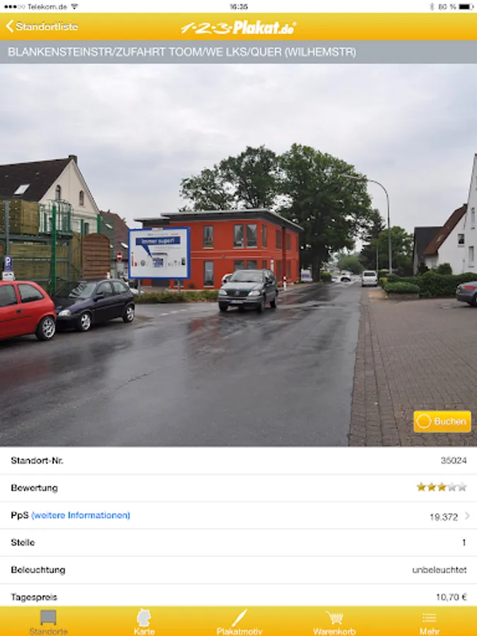 1-2-3-Plakat.de is a mobile platform for Germany-wide billboards. The program offers direct access to all 180,000 large area billboards throughout Germany. The locations are backed with photos, descriptions, availability and rental rates today. You can book the sites directly and give the poster the same with in order. Thus your outdoor advertising campaign is posted in a few minutes.