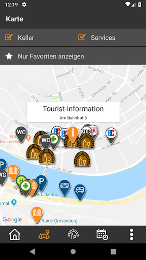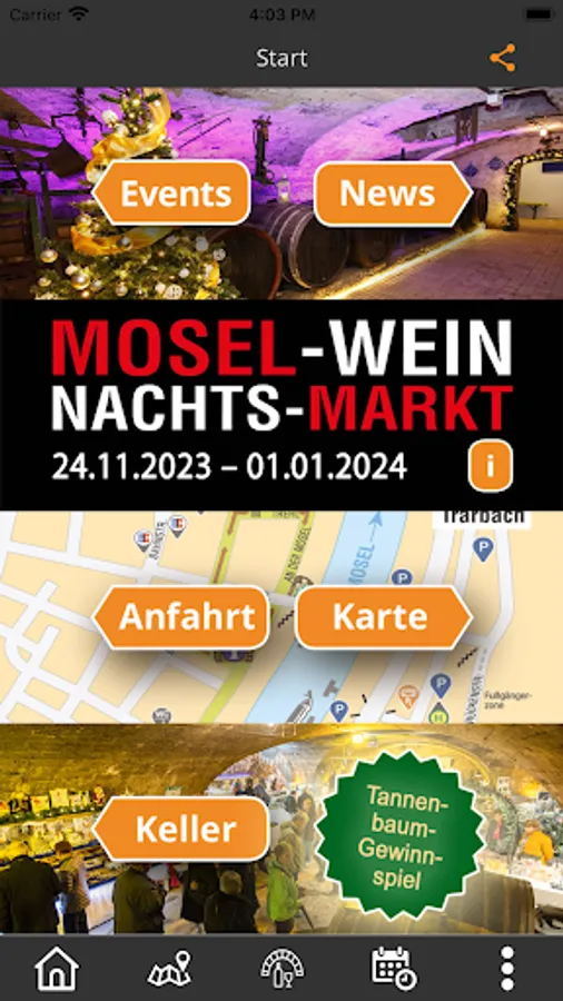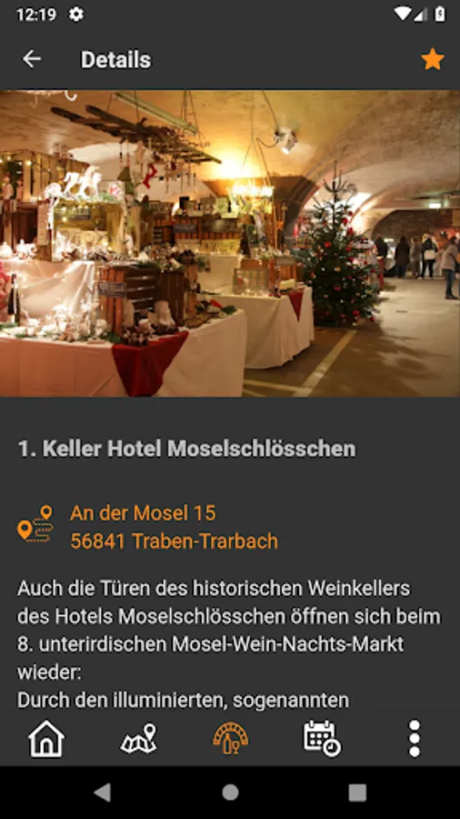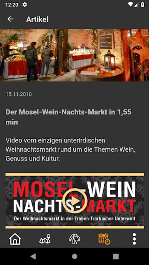 With the Moselle Wine Night Market app, you will receive the latest news from the Christmas market in the wine cellar underworld of Traben-Trarbach. It provides an overview of the opening hours, events, parking facilities, bus timetables and much more.