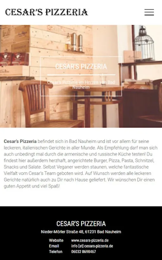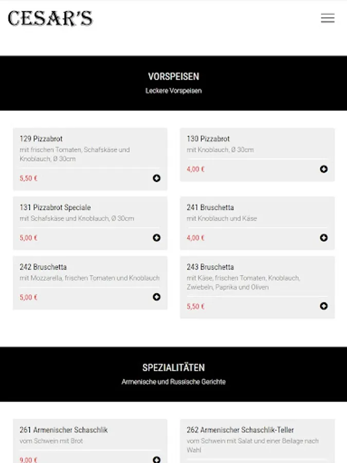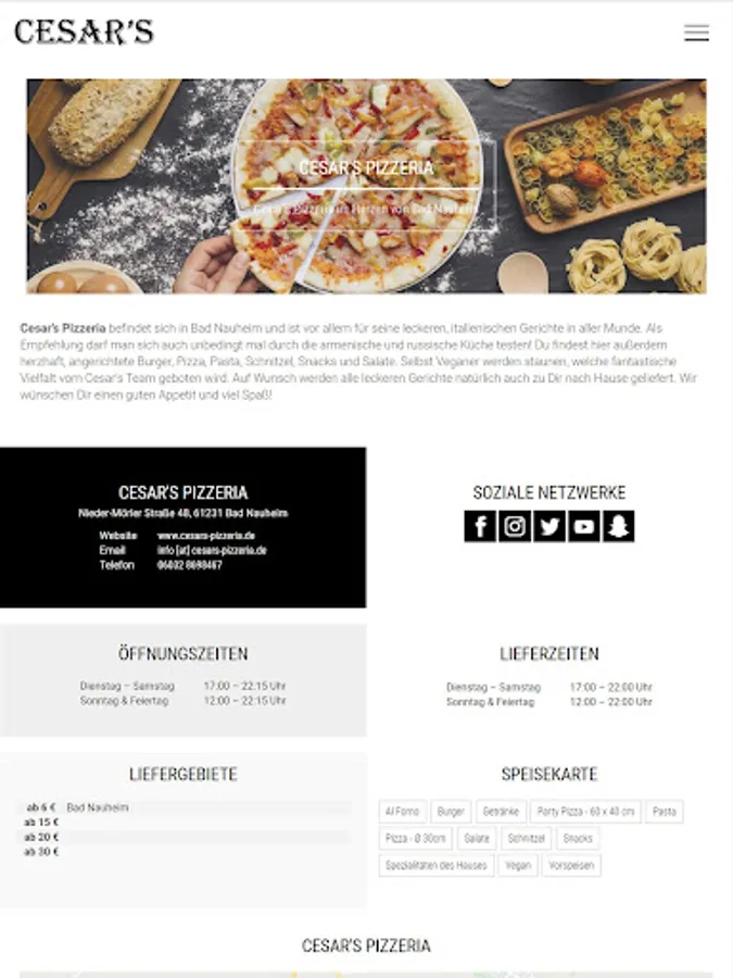 Cesar's Pizzeria is located in Bad Nauheim and is especially popular for its delicious Italian dishes. As a recommendation, one must also try out times by the Armenian and Russian cuisine! You will also find hearty, prepared burgers, pizza, pasta, schnitzel, snacks and salads. Even vegans will be amazed at the fantastic variety offered by the Cesar's team. On request, all delicious dishes are of course also delivered to your home. We wish you a good appetite and have fun!