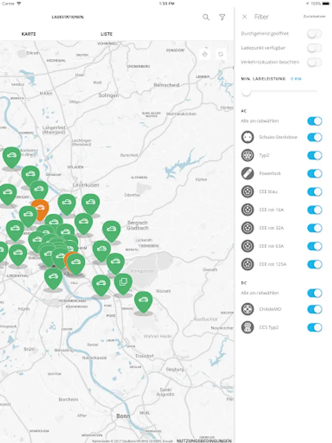 • Live display of all available charging points Auto power network and charging points of connected partners
