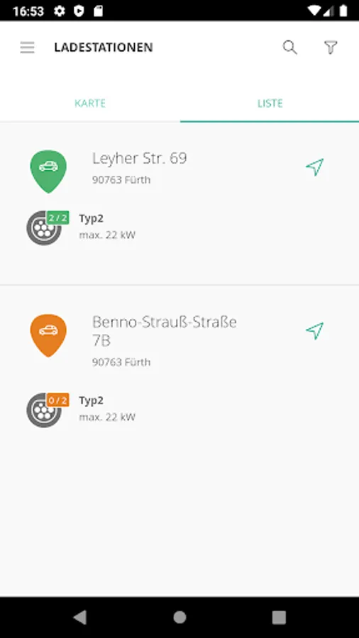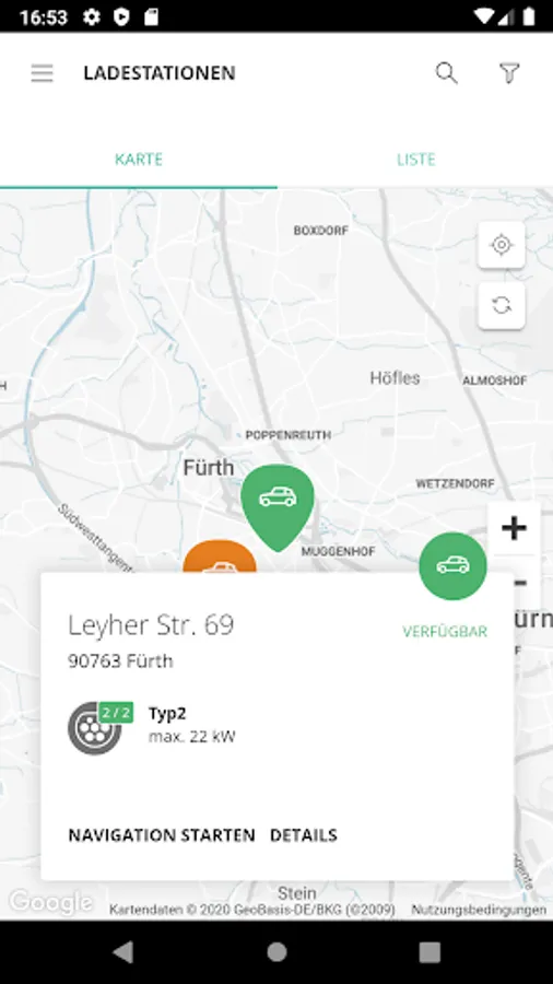 The overview map shows you where you can find the nearest charging station. The color of the marking shows the current availability. You can also view information about possible malfunctions. Simply select a charging station of your choice and use the navigation function to navigate directly to it.