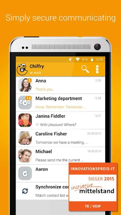 Chiffry is the first communication app with the quality label "IT Security made in Germany". This encrypted messenger allows you to send text and voice messages securely, share pictures, videos, contacts and locations confidentially and also make tap-proof phone calls.